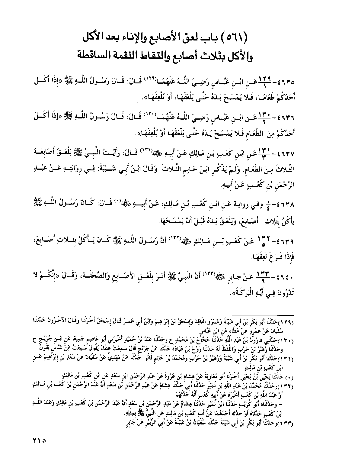 4639 - عن كعب بن مالك رضي الله عنه أن رسول الله صلى الله عليه وسلم كان يأكل بثلاث أصابع، فإذا فرغ لعقها.