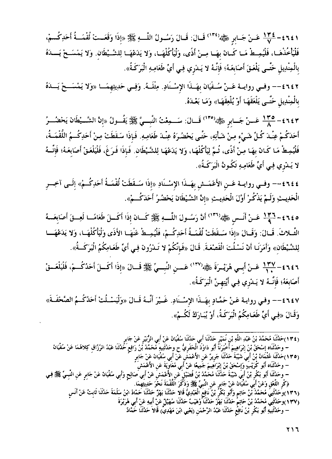 4641 - عن جابر رضي الله عنه قال: قال رسول الله صلى الله عليه وسلم "إذا وقعت لقمة أحدكم، فليأخذها، فليمط ما كان بها من أذى، وليأكلها، ولا يدعها للشيطان. ولا يمسح يده بالمنديل حتى يلعق أصابعه؛ فإنه لا يدري في أي طعامه البركة".