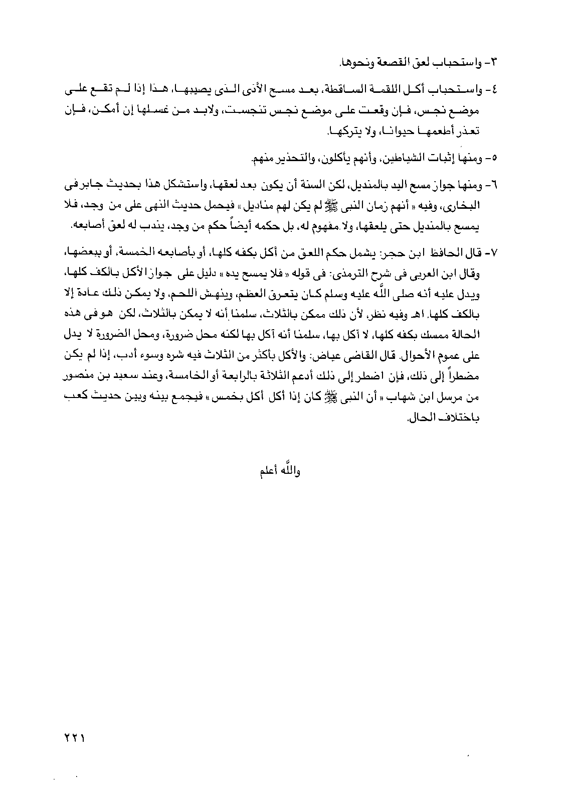 7 - قال الحافظ ابن حجر: يشمل حكم اللعق من أكل بكفه كلها، أو بأصابعه الخمسة، أو ببعضها، وقال ابن العربي في شرح الترمذي: في قوله "فلا يمسح يده" دليل على جواز الأكل بالكف كلها، ويدل عليه أنه صلى الله عليه وسلم كان يتعرق العظم، وينهش اللحم، ولا يمكن ذلك عادة إلا بالكف كلها. اهـ وفيه نظر، لأن ذلك ممكن بالثلاث، سلمنا أنه لا يمكن بالثلاث، لكن هو في هذه الحالة ممسك بكفه كلها، لا آكل بها، سلمنا أنه آكل بها لكنه محل ضرورة، ومحل الضرورة لا يدل على عموم الأحوال. قال القاضي عياض: والأكل بأكثر من الثلاث فيه شره وسوء أدب، إذا لم يكن مضطراً إلى ذلك، فإن اضطر إلى ذلك أدعم الثلاثة بالرابعة أو الخامسة، وعند سعيد بن منصور من مرسل ابن شهاب "أن النبي صلى الله عليه وسلم كان إذا أكل أكل بخمس" فيجمع بينه وبين حديث كعب باختلاف الحال.