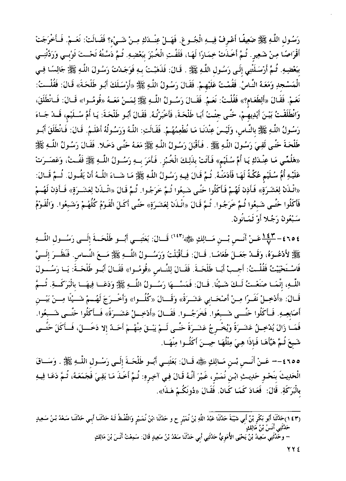 رسول الله صلى الله عليه وسلم ضعيفاً أعرف فيه الجوع. فهل عندك من شيء؟ فقالت: نعم. فأخرجت أقراصاً من شعير. ثم أخذت خماراً لها، فلفت الخبز ببعضه. ثم دسته تحت ثوبي وردتني ببعضه. ثم أرسلتني إلى رسول الله صلى الله عليه وسلم. قال: فذهبت به فوجدت رسول الله صلى الله عليه وسلم جالساً في المسجد ومعه الناس. فقمت عليهم. فقال رسول الله صلى الله عليه وسلم "أرسلك أبو طلحة" قال: فقلت: نعم. فقال "ألطعام؟ " فقلت: نعم. فقال رسول الله صلى الله عليه وسلم لمن معه "قوموا" قال: فانطلق، وانطلقت بين أيديهم، حتى جئت أبا طلحة، فأخبرته. فقال أبو طلحة: يا أم سليم، قد جاء رسول الله صلى الله عليه وسلم بالناس، وليس عندنا ما نطعمهم. فقالت: الله ورسوله أعلم. قال: فانطلق أبو طلحة حتى لقي رسول الله صلى الله عليه وسلم. فأقبل رسول الله صلى الله عليه وسلم معه حتى دخلا. فقال رسول الله صلى الله عليه وسلم "هلمي ما عندك يا أم سليم" فأتت بذلك الخبز. فأمر به رسول الله صلى الله عليه وسلم ففت، وعصرت عليه أم سليم عكة لها فأدمته. ثم قال فيه رسول الله صلى الله عليه وسلم ما شاء الله أن يقول. ثم قال: "ائذن لعشرة" فأذن لهم فأكلوا حتى شبعوا ثم خرجوا. ثم قال "ائذن لعشرة" فأذن لهم فأكلوا حتى شبعوا ثم خرجوا. ثم قال "ائذن لعشرة" حتى أكل القوم كلهم وشبعوا. والقوم سبعون رجلاً أو ثمانون.