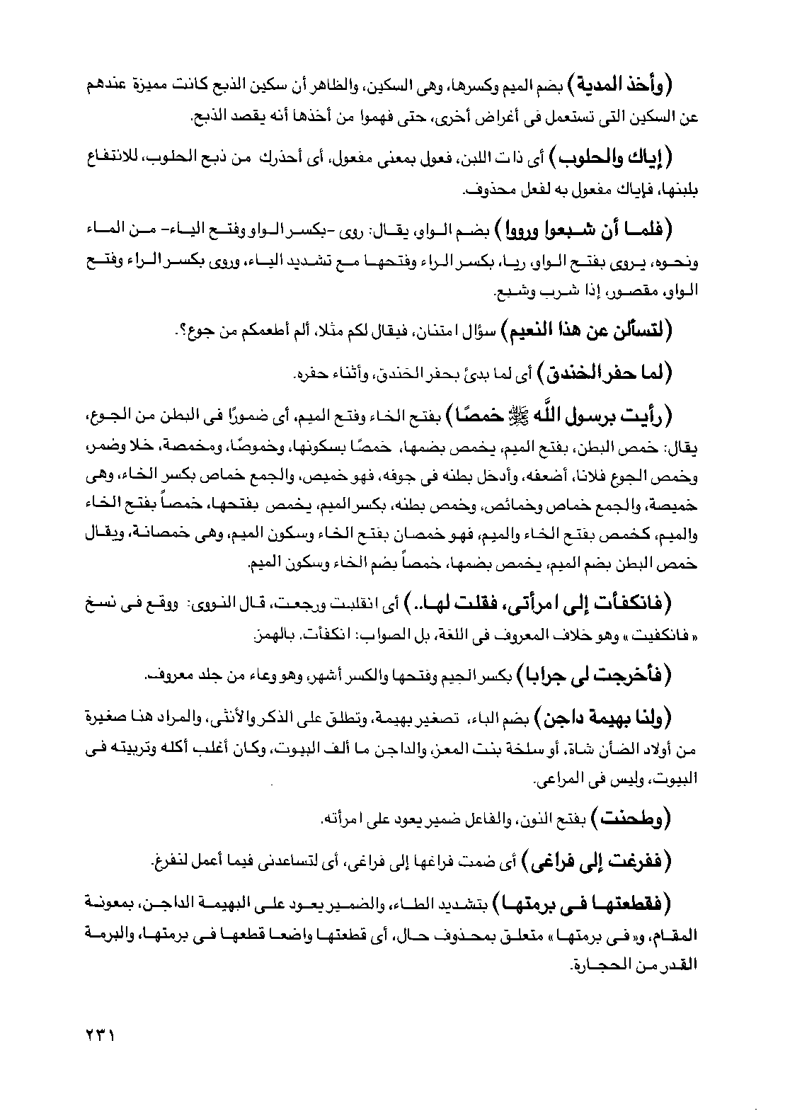 (فقطعتها في برمتها) بتشديد الطاء، والضمير يعود على البهيمة الداجن، بمعونة المقام، و"في برمتها" متعلق بمحذوف حال، أي قطعتها واضعاً قطعها في برمتها، والبرمة القدر من الحجارة.