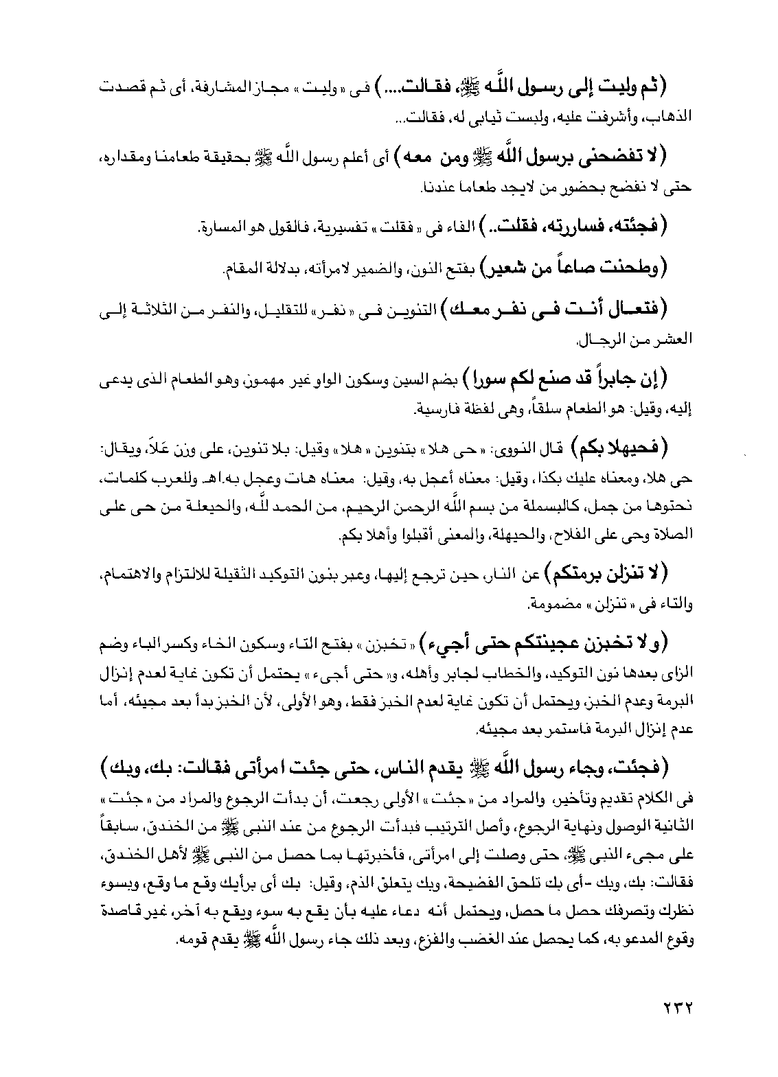 (ولا تخبزن عجينتكم حتى أجيء) "تخبزن" بفتح التاء وسكون الخاء وكسر الباء وضم الزاي بعدها نون التوكيد، والخطاب لجابر وأهله، و"حتى أجيء" يحتمل أن تكون غاية لعدم إنزال البرمة وعدم الخبز، ويحتمل أن تكون غاية لعدم الخبز فقط، وهو الأولى، لأن الخبز بدأ بعد مجيئه، أما عدم إنزال البرمة فاستمر بعد مجيئه.