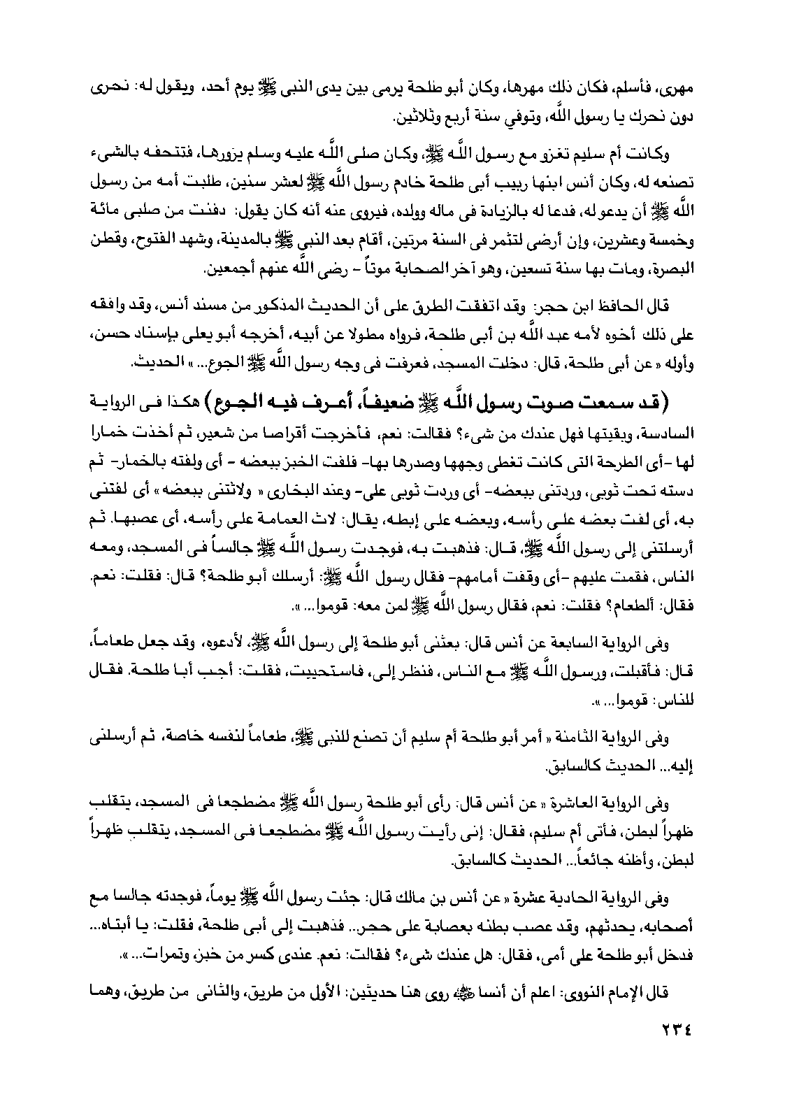 وفي الرواية العاشرة "عن أنس قال: رأى أبو طلحة رسول الله صلى الله عليه وسلم مضطجعاً في المسجد، يتقلب ظهراً لبطن، فأتى أم سليم، فقال: إني رأيت رسول الله صلى الله عليه وسلم مضطجعاً في المسجد، يتقلب ظهراً لبطن، وأظنه جائعاً ... الحديث كالسابق.