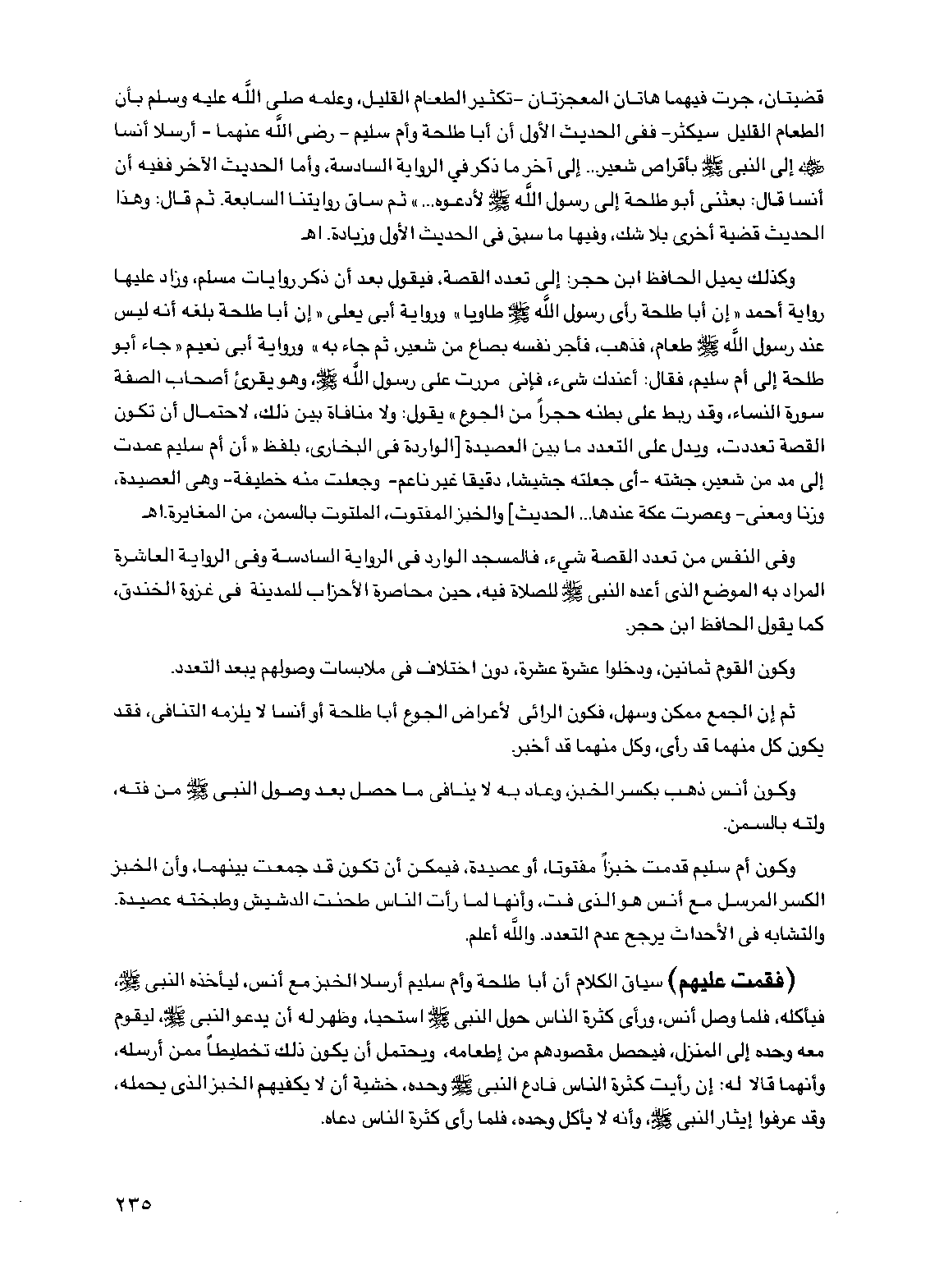 وكذلك يميل الحافظ ابن حجر: إلى تعدد القصة، فيقول بعد أن ذكر روايات مسلم، وزاد عليها رواية أحمد "إن أبا طلحة رأى رسول الله صلى الله عليه وسلم طاوياً" ورواية أبي يعلى "إن أبا طلحة بلغه أنه ليس عند رسول الله صلى الله عليه وسلم طعام، فذهب، فأجر نفسه بصاع من شعير، ثم جاء به" ورواية أبي نعيم "جاء أبو طلحة إلى أم سليم، فقال: أعندك شيء، فإني مررت على رسول الله صلى الله عليه وسلم، وهو يقرئ أصحاب الصفة سورة النساء، وقد ربط على بطنه حجراً من الجوع" يقول: ولا منافاة بين ذلك، لاحتمال أن تكون القصة تعددت، ويدل على التعدد ما بين العصيدة [الواردة في البخاري، بلفظ "أن أم سليم عمدت إلى مد من شعير، جشته -أي جعلته جشيشاً، دقيقاً غير ناعم- وجعلت منه خطيفة -وهي العصيدة، وزناً ومعنى- وعصرت عكة عندها .... الحديث] والخبز المفتوت، الملتوت بالسمن، من المغايرة. اهـ