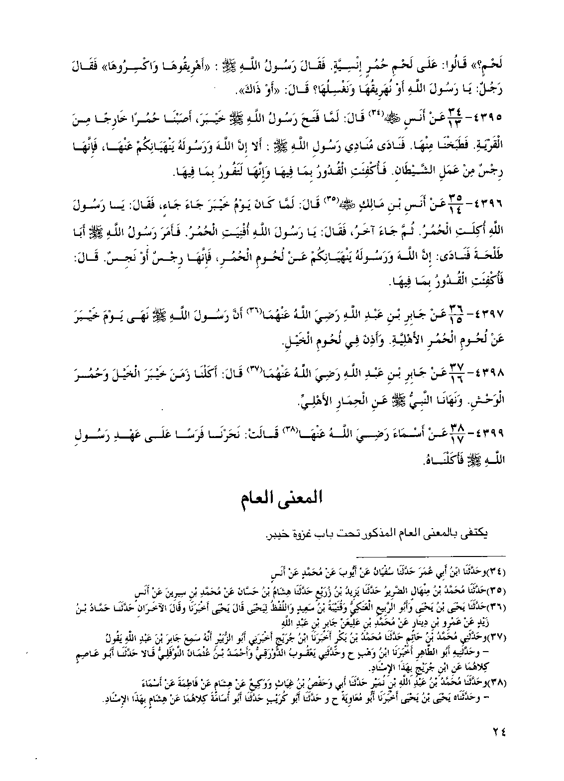 4395 - عن أنس رضي الله عنه قال: لما فتح رسول الله صلى الله عليه وسلم خيبر، أصبنا حمراً خارجاً من القرية. فطبخنا منها. فنادى منادي رسول الله صلى الله عليه وسلم: ألا إن الله ورسوله ينهيانكم عنها، فإنها رجس من عمل الشيطان. فأكفئت القدور بما فيها وإنها لتفور بما فيها.