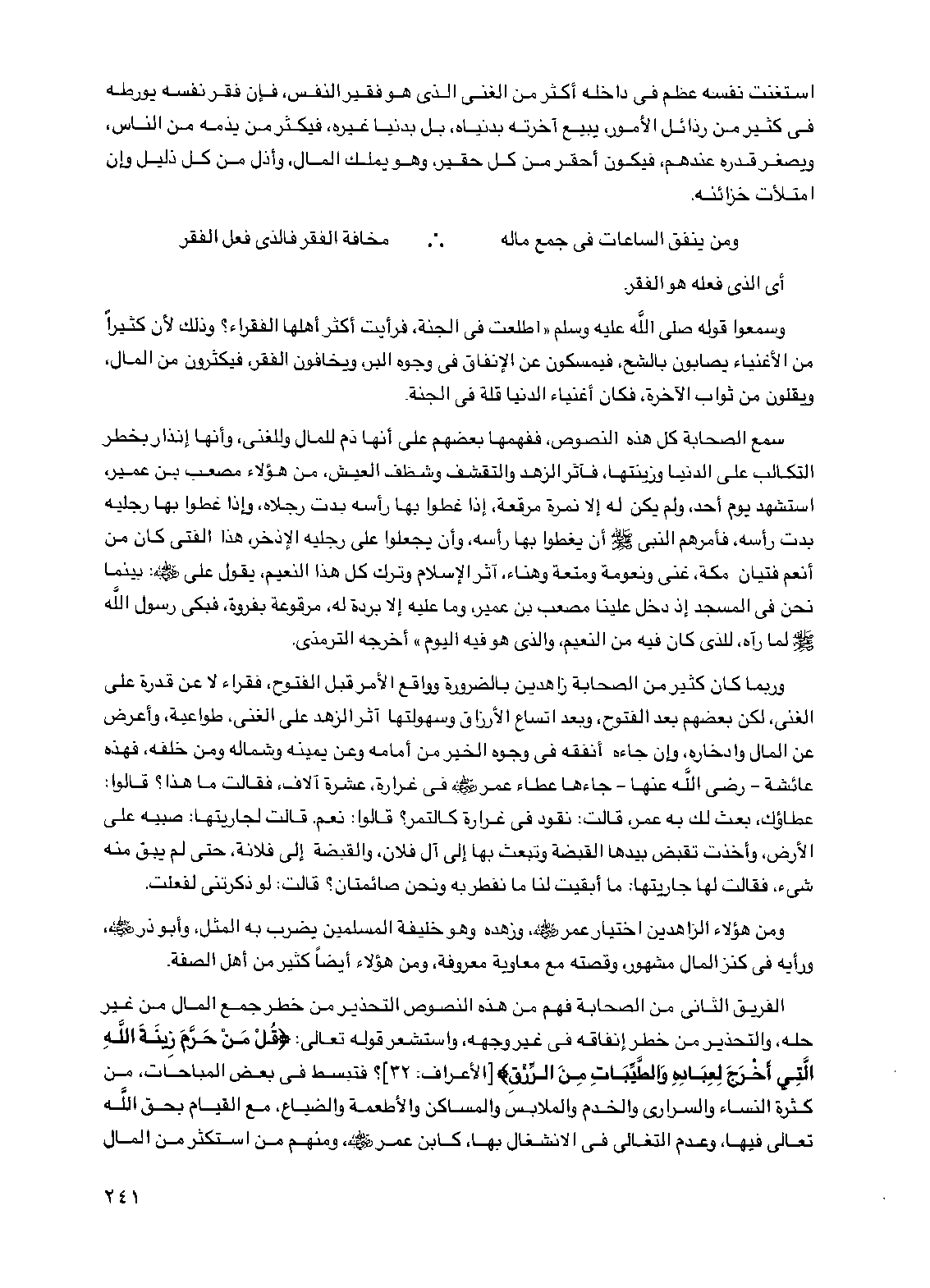 سمع الصحابة كل هذه النصوص، ففهمها بعضهم على أنها ذم للمال وللغنى، وأنها إنذار بخطر التكالب على الدنيا وزينتها، فآثر الزهد والتقشف وشظف العيش، من هؤلاء مصعب بن عمير، استشهد يوم أحد، ولم يكن له إلا نمرة مرقعة، إذا غطوا بها رأسه بدت رجلاه، وإذا غطوا بها رجليه بدت رأسه، فأمرهم النبي صلى الله عليه وسلم أن يغطوا بها رأسه، وأن يجعلوا على رجليه الإذخر، هذا الفتى كان من أنعم فتيان مكة، غنى ونعومة ومتعة وهناء، آثر الإسلام وترك كل هذا النعيم، يقول علي رضي الله عنه: بينما نحن في المسجد إذ دخل علينا مصعب بن عمير، وما عليه إلا بردة له، مرقوعة بفروة، فبكى رسول الله صلى الله عليه وسلم لما رآه، للذي كان فيه من النعيم، والذي هو فيه اليوم" أخرجه الترمذي.