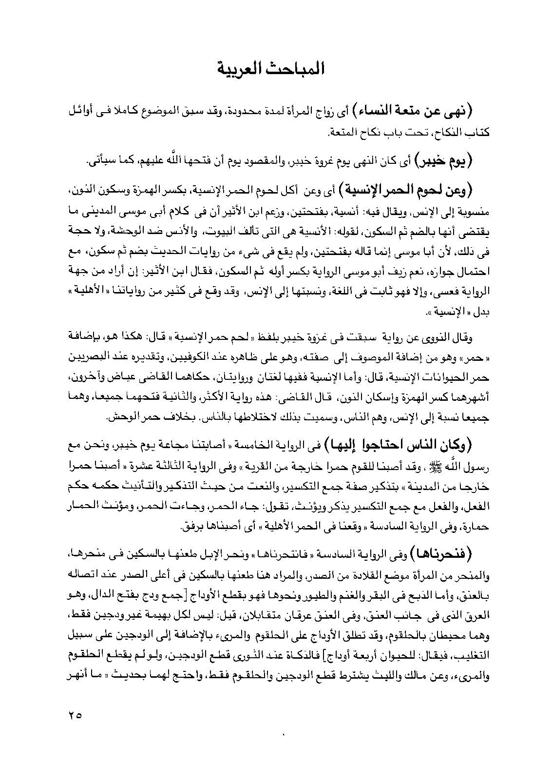 (وكان الناس احتاجوا إليها) في الرواية الخامسة "أصابتنا مجاعة يوم خيبر، ونحن مع رسول الله صلى الله عليه وسلم، وقد أصبنا للقوم حمراً خارجة من القرية" وفي الرواية الثالثة عشرة "أصبنا حمراً خارجاً من المدينة" بتذكير صفة جمع التكسير، والنعت من حيث التذكير والتأنيث حكمه حكم الفعل، والفعل مع جمع التكسير يذكر ويؤنث، تقول: جاء الحمر، وجاءت الحمر، ومؤنث الحمار حمارة، وفي الرواية السادسة "وقعنا في الحمر الأهلية" أي أصبناها برفق.