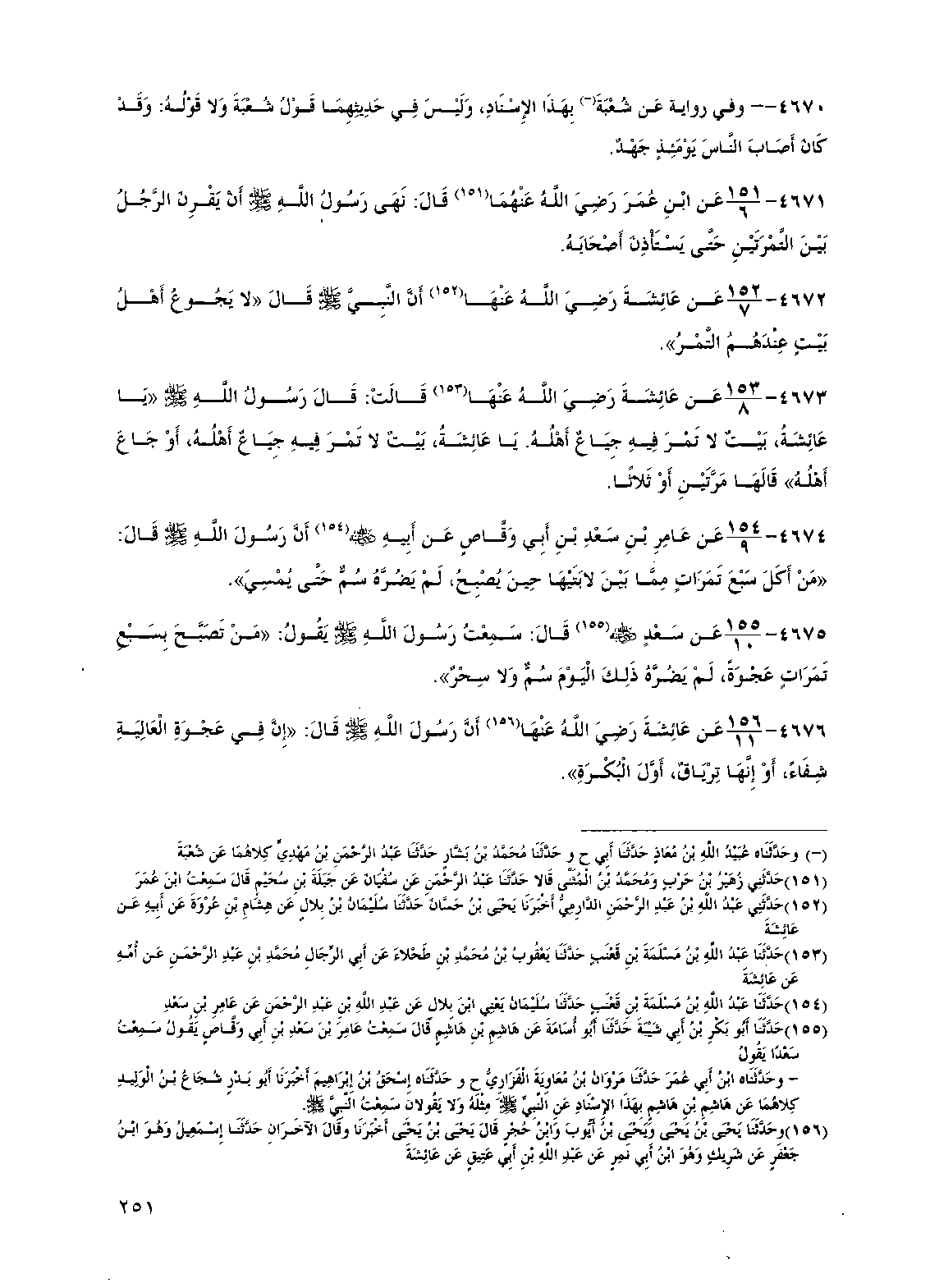4674 - عن عامر بن سعد بن أبي وقاص عن أبيه رضي الله عنه أن رسول الله صلى الله عليه وسلم قال: "من أكل سبع تمرات مما بين لابتيها حين يصبح، لم يضره سم حتى يمسي".