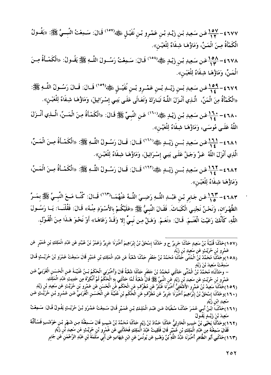 4677 - عن سعيد بن زيد بن عمرو بن نفيل رضي الله عنه قال: سمعت النبي صلى الله عليه وسلم: "يقول الكمأة من المن؛ وماؤها شفاء للعين".