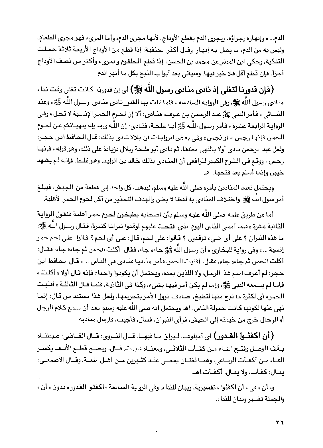 (فإن قدورنا لتغلي إذ نادى منادي رسول الله صلى الله عليه وسلم) أي إن قدورنا كانت تغلي وقت نداء منادي رسول الله صلى الله عليه وسلم، وفي الرواية السادسة "فلما غلت بها القدور نادى منادي رسول الله صلى الله عليه وسلم" وعند النسائي "فأمر النبي صلى الله عليه وسلم عبد الرحمن بن عوف، فنادى: ألا إن لحوم الحمر الإنسية لا تحل" وفي الرواية الرابعة عشرة "فأمر رسول الله صلى الله عليه وسلم أبا طلحة، فنادى: إن الله ورسوله ينهيانكم عن لحوم الحمر، فإنها رجس -أو نجس" وفي بعض الروايات أن بلالاً نادى بذلك: قال الحافظ ابن حجر: ولعل عبد الرحمن نادى أولاً بالنهي مطلقاً، ثم نادى أبو طلحة وبلال بزيادة على ذلك، وهو قوله "فإنها رجس" ووقع في الشرح الكبير للرافعي أن المنادي بذلك خالد بن الوليد، وهو غلط، فإنه لم يشهد خيبر، وإنما أسلم بعد فتحها. اهـ