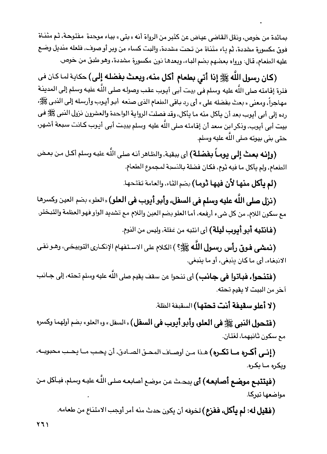 (نزل صلى الله عليه وسلم في السفل، وأبو أيوب في العلو) "العلو" بضم العين وكسرها مع سكون اللام، من كل شيء أرفعه، أما العلو بضم العين واللام مع تشديد الواو فهو العظمة والتبختر.