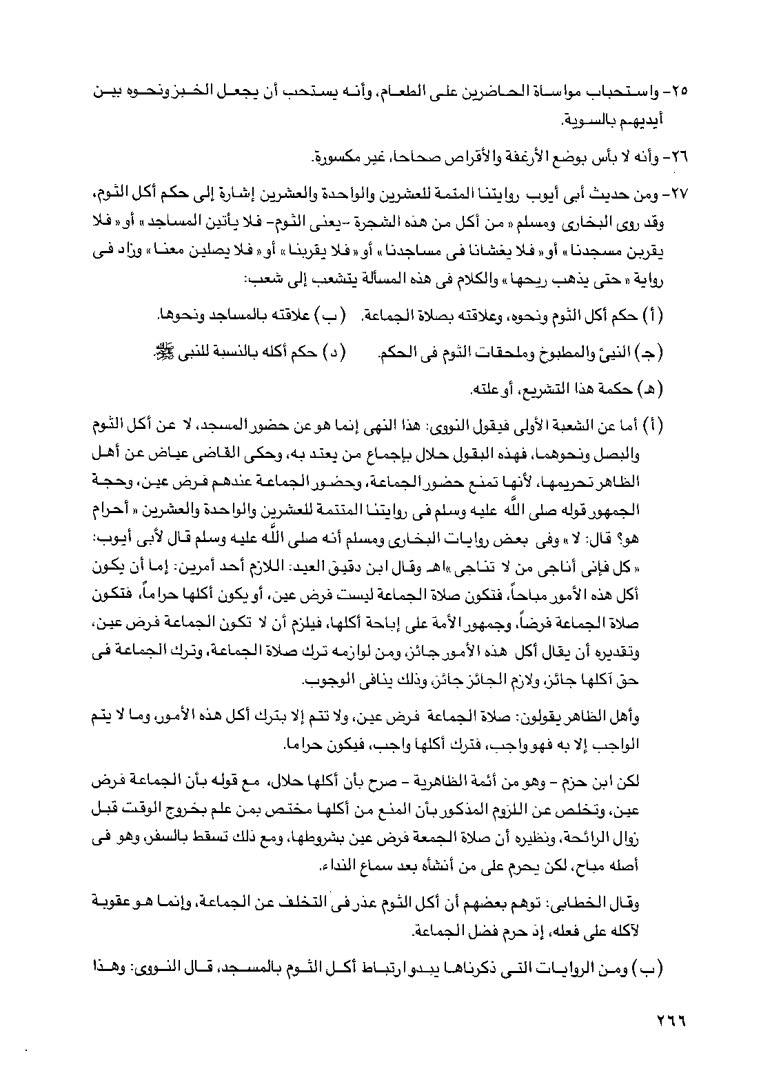(أ) أما عن الشعبة الأولى فيقول النووي: هذا النهي إنما هو عن حضور المسجد، لا عن أكل الثوم والبصل ونحوهما، فهذه البقول حلال بإجماع من يعتد به، وحكى القاضي عياض عن أهل الظاهر تحريمها، لأنها تمنع حضور الجماعة، وحضور الجماعة عندهم فرض عين، وحجة الجمهور قوله صلى الله عليه وسلم في روايتنا المتتمة للعشرين والواحدة والعشرين "أحرام هو؟ قال: لا" وفي بعض روايات البخاري ومسلم أنه صلى الله عليه وسلم قال لأبي أيوب: "كل فإني أناجي من لا تناجي" اهـ وقال ابن دقيق العيد: اللازم أحد أمرين: إما أن يكون أكل هذه الأمور مباحاً، فتكون صلاة الجماعة ليست فرض عين، أو يكون أكلها حراماً، فتكون صلاة الجماعة فرضاً، وجمهور الأمة على إباحة أكلها، فيلزم أن لا تكون الجماعة فرض عين، وتقديره أن يقال أكل هذه الأمور جائز، ومن لوازمه ترك صلاة الجماعة، وترك الجماعة في حق آكلها جائز، ولازم الجائز جائز، وذلك ينافي الوجوب.