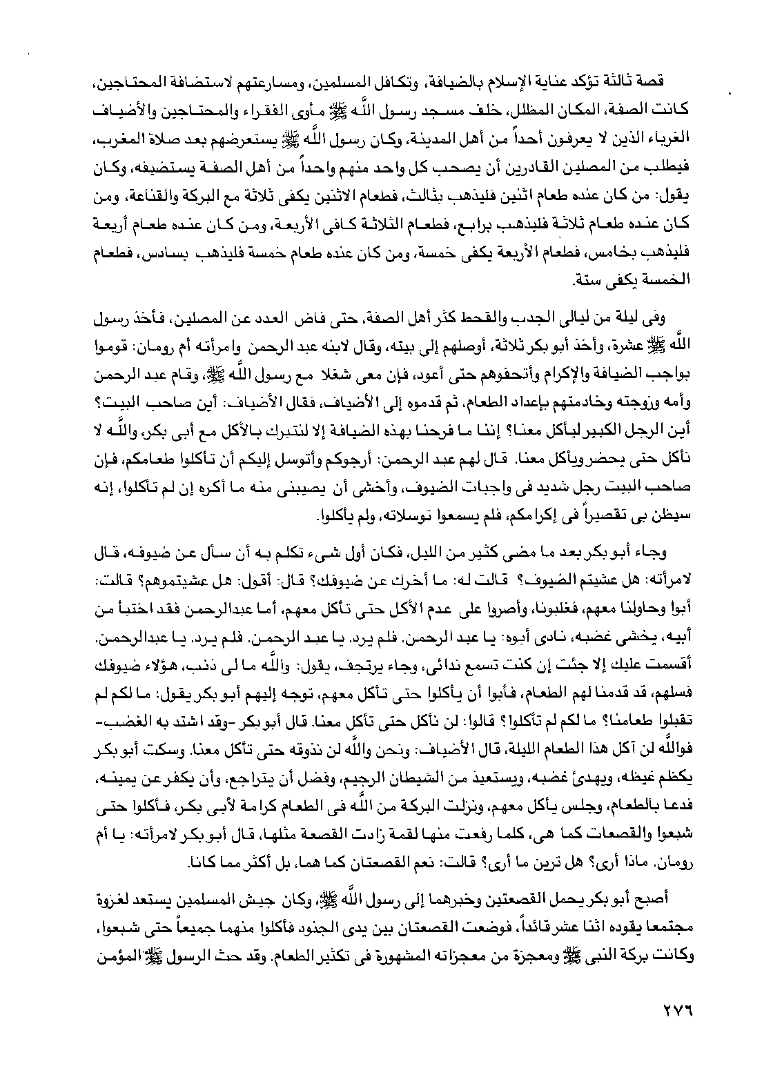 قصة ثالثة تؤكد عناية الإسلام بالضيافة، وتكافل المسلمين، ومسارعتهم لاستضافة المحتاجين، كانت الصفة، المكان المظلل، خلف مسجد رسول الله صلى الله عليه وسلم مأوى الفقراء والمحتاجين والأضياف الغرباء الذين لا يعرفون أحداً من أهل المدينة، وكان رسول الله صلى الله عليه وسلم يستعرضهم بعد صلاة المغرب، فيطلب من المصلين القادرين أن يصحب كل واحد منهم واحداً من أهل الصفة يستضيفه، وكان يقول: من كان عنده طعام اثنين فليذهب بثالث، فطعام الاثنين يكفي ثلاثة مع البركة والقناعة، ومن كان عنده طعام ثلاثة فليذهب برابع، فطعام الثلاثة كافي الأربعة، ومن كان عنده طعام أربعة فليذهب بخامس، فطعام الأربعة يكفي خمسة، ومن كان عنده طعام خمسة فليذهب بسادس، فطعام الخمسة يكفي ستة.