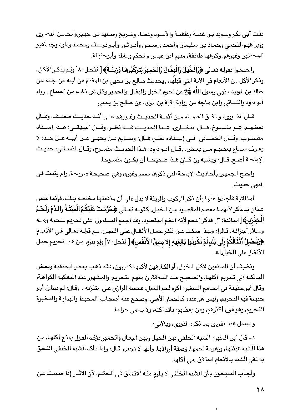 أما الآية فأجابوا عنها بأن ذكر الركوب والزينة لا يدل على أن منفعتها مختصة بذلك، فإنما خص هذان بالذكر لأنهما معظم المقصود من الخيل، كقوله تعالى {حرمت عليكم الميتة والدم ولحم الخنزير} [المائدة: 3] فذكر اللحم لأنه أعظم المقصود، وقد أجمع المسلمون على تحريم شحمه ودمه وسائر أجزائه، قالوا: ولهذا سكت عن ذكر حمل الأثقال على الخيل، مع قوله تعالى في الأنعام {وتحمل أثقالكم إلى بلد لم تكونوا بالغيه إلا بشق الأنفس} [النحل: 7] ولم يلزم من هذا تحريم حمل الأثقال على الخيل. اهـ
