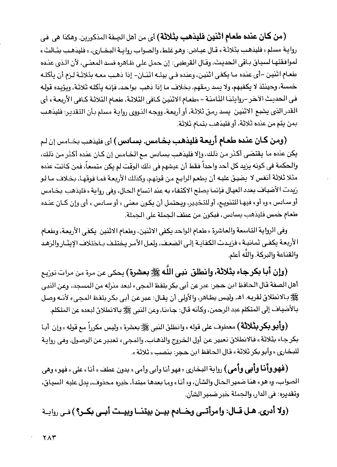 (وأبو بكر بثلاثة) معطوف على قوله "وانطلق النبي صلى الله عليه وسلم بعشرة" وليس مكرراً مع قوله "وإن أبا بكر جاء بثلاثة" فالانطلاق تعبير عن أول الخروج والذهاب، والمجيء تعبير عن الوصول، وفي رواية للبخاري "وأبو بكر ثلاثة" قال الحافظ ابن حجر: بنصب "ثلاثة".