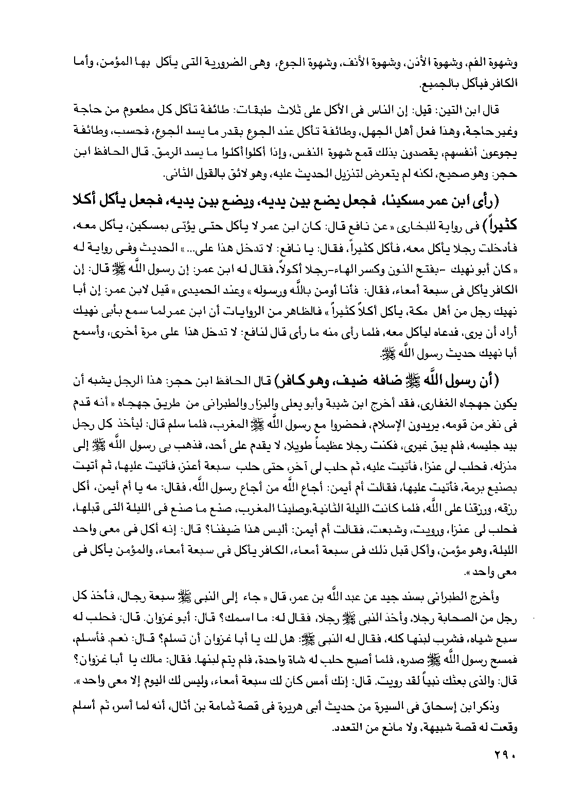 قال ابن التين: قيل: إن الناس في الأكل على ثلاث طبقات: طائفة تأكل كل مطعوم من حاجة وغير حاجة، وهذا فعل أهل الجهل، وطائفة تأكل عند الجوع بقدر ما يسد الجوع، فحسب، وطائفة يجوعون أنفسهم، يقصدون بذلك قمع شهوة النفس، وإذا أكلوا أكلوا ما يسد الرمق. قال الحافظ ابن حجر: وهو صحيح، لكنه لم يتعرض لتنزيل الحديث عليه، وهو لائق بالقول الثاني.