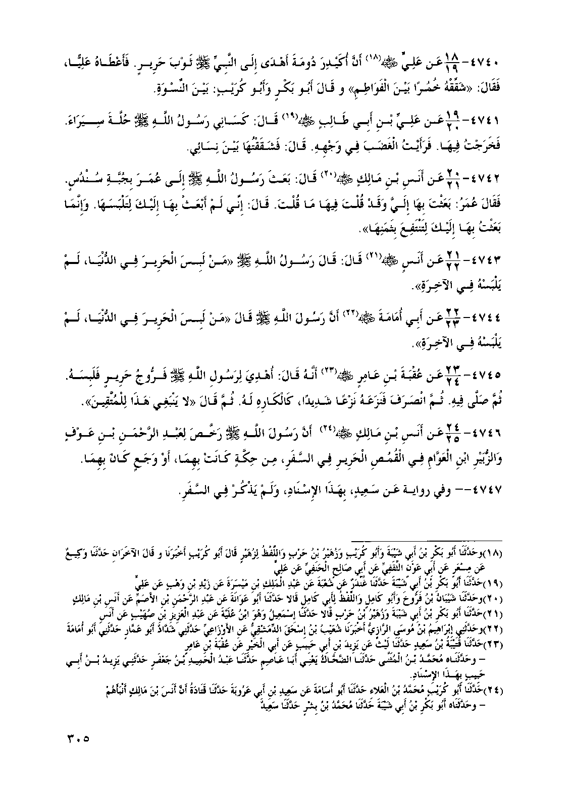 4743 - عن أنس رضي الله عنه قال: قال رسول الله صلى الله عليه وسلم "من لبس الحرير في الدنيا، لم يلبسه في الآخرة".