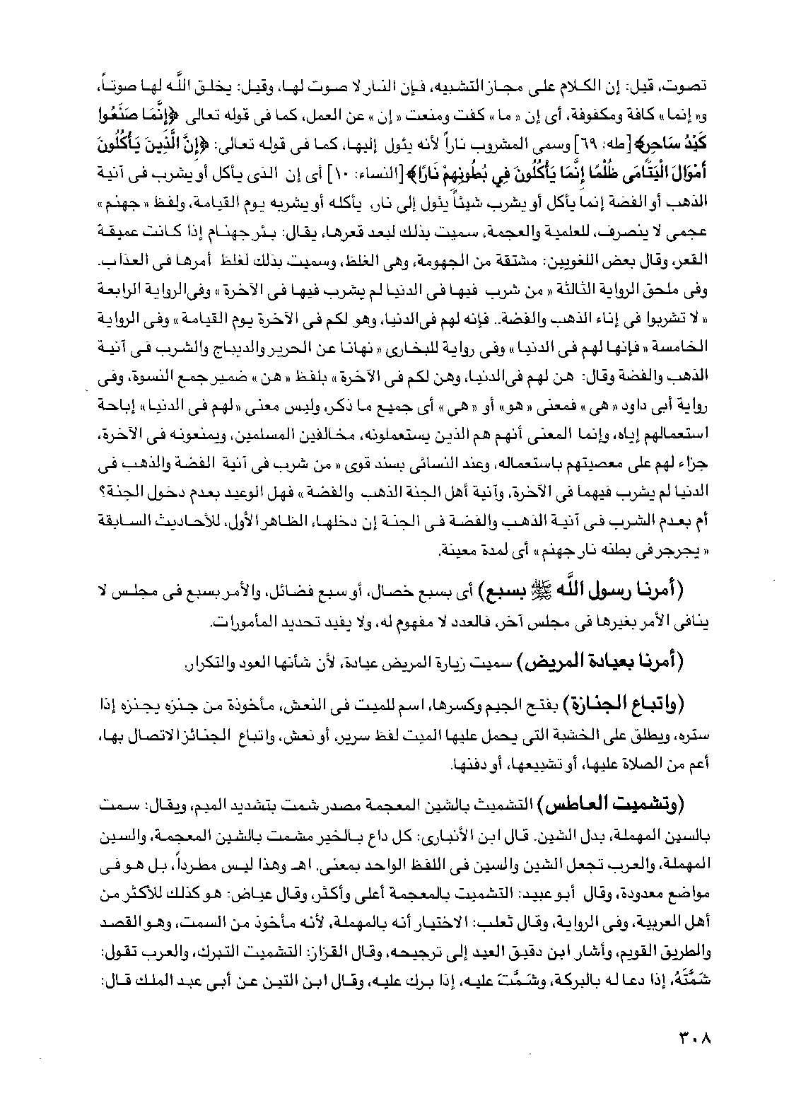 تصوت، قيل: إن الكلام على مجاز التشبيه، فإن النار لا صوت لها، وقيل: يخلق الله لها صوتاً، و"إنما" كافة ومكفوفة، أي إن "ما" كفت ومنعت "إن" عن العمل، كما في قوله تعالى {إنما صنعوا كيد ساحر} [طه: 69] وسمي المشروب ناراً لأنه يئول إليها، كما في قوله تعالى: {إن الذين يأكلون أموال اليتامى ظلماً إنما يأكلون في بطونهم ناراً} [النساء: 10] أي إن الذي يأكل أو يشرب في آنية الذهب أو الفضة إنما يأكل أو يشرب شيئاً يئول إلى نار، يأكله أو يشربه يوم القيامة، ولفظ "جهنم" عجمي لا ينصرف، للعلمية والعجمة، سميت بذلك لبعد قعرها، يقال: بئر جهنام إذا كانت عميقة القعر، وقال بعض اللغويين: مشتقة من الجهومة، وهي الغلظ، وسميت بذلك لغلظ أمرها في العذاب. وفي ملحق الرواية الثالثة "من شرب فيها في الدنيا لم يشرب فيها في الآخرة" وفي الرواية الرابعة "لا تشربوا في إناء الذهب والفضة ...