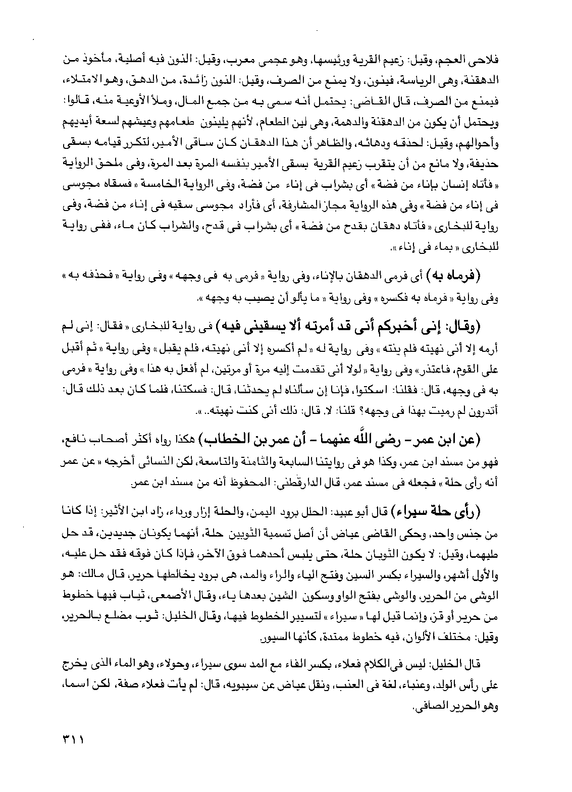 (رأى حلة سيراء) قال أبو عبيد: الحلل برود اليمن، والحلة إزار ورداء، زاد ابن الأثير: إذا كانا من جنس واحد، وحكى القاضي عياض أن أصل تسمية الثوبين حلة، أنهما يكونان جديدين، قد حل طيهما، وقيل: لا يكون الثوبان حلة، حتى يلبس أحدهما فوق الآخر، فإذا كان فوقه فقد حل عليه، والأول أشهر، والسيراء بكسر السين وفتح الياء والراء والمد، هي برود يخالطها حرير، قال مالك: هو الوشى من الحرير، والوشى بفتح الواو وسكون الشين بعدها ياء، وقال الأصمعي، ثياب فيها خطوط من حرير أو قز، وإنما قيل لها "سيراء" لتسيير الخطوط فيها، وقال الخليل: ثوب مضلع بالحرير، وقيل: مختلف الألوان، فيه خطوط ممتدة، كأنها السيور.