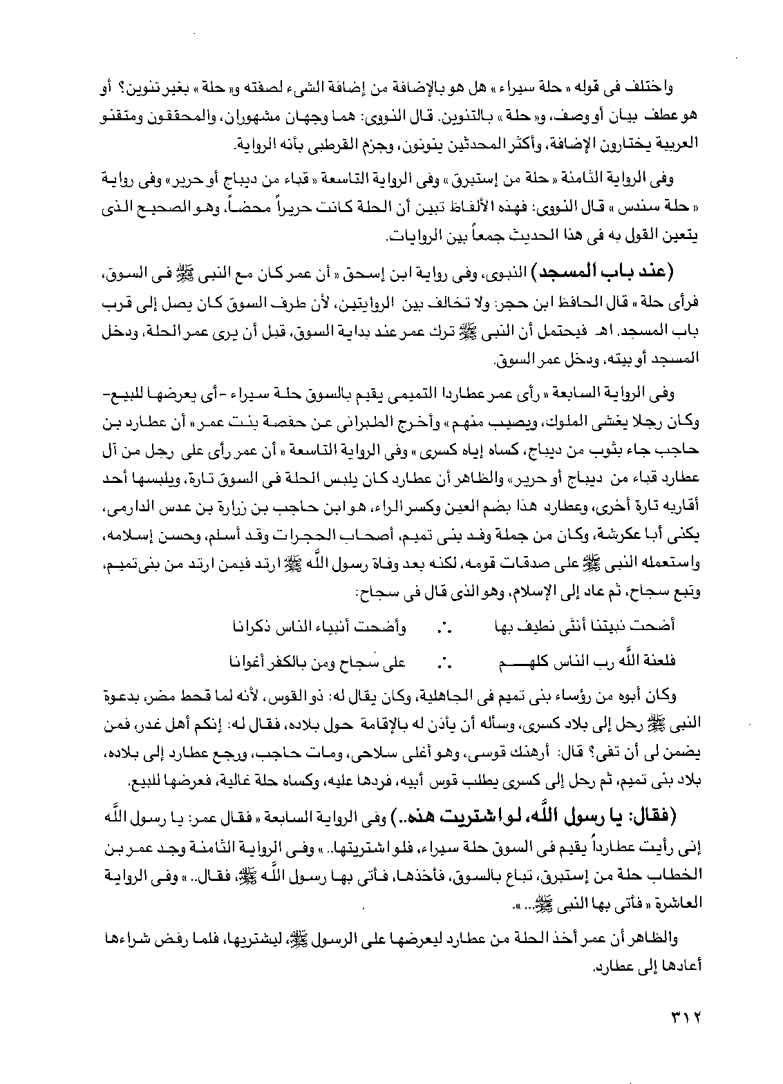 واختلف في قوله "حلة سيراء" هل هو بالإضافة من إضافة الشيء لصفته و"حلة" بغير تنوين؟ أو هو عطف بيان أو وصف، و"حلة" بالتنوين. قال النووي: هما وجهان مشهوران، والمحققون ومتقنو العربية يختارون الإضافة، وأكثر المحدثين ينونون، وجزم القرطبي بأنه الرواية.