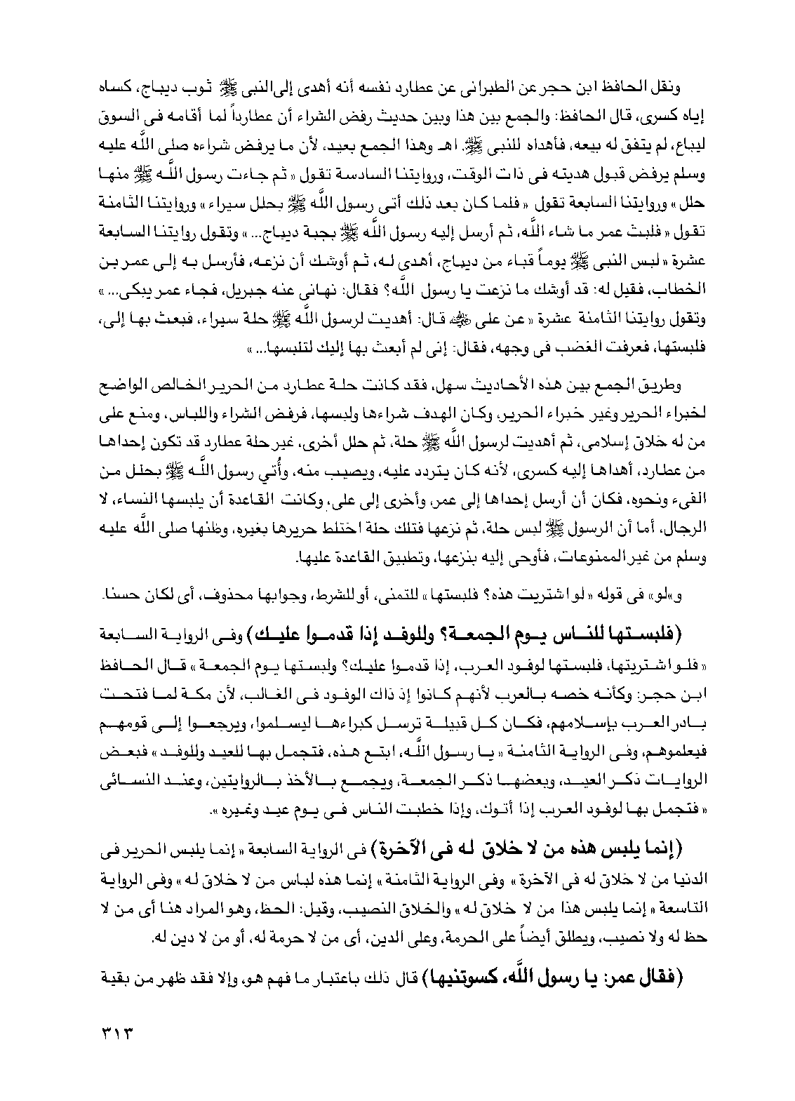 (فلبستها للناس يوم الجمعة؟ وللوفد إذا قدموا عليك) وفي الرواية السابعة "فلو اشتريتها، فلبستها لوفود العرب، إذا قدموا عليك؟ ولبستها يوم الجمعة" قال الحافظ ابن حجر: وكأنه خصه بالعرب لأنهم كانوا إذ ذاك الوفود في الغالب، لأن مكة لما فتحت بادر العرب بإسلامهم، فكان كل قبيلة ترسل كبراءها ليسلموا، ويرجعوا إلى قومهم فيعلموهم، وفي الرواية الثامنة "يا رسول الله، ابتع هذه، فتجمل بها للعيد وللوفد" فبعض الروايات ذكر العيد، وبعضها ذكر الجمعة، ويجمع بالأخذ بالروايتين، وعند النسائي "فتجمل بها لوفود العرب إذا أتوك، وإذا خطبت الناس في يوم عيد وغيره".