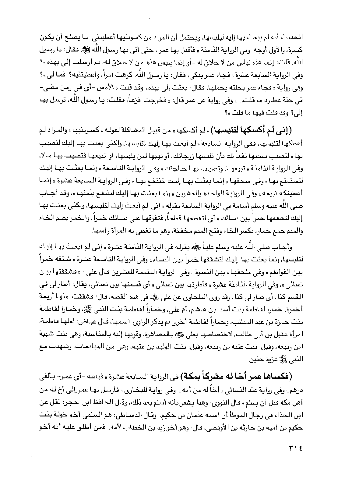 (إني لم أكسكها لتلبسها) "لم أكسكها" من قبيل المشاكلة لقوله "كسوتنيها" والمراد لم أعطكها لتلبسها، ففي الرواية السابعة "لم أبعث بها إليك لتلبسها، ولكني بعثت بها إليك لتصيب بها" لتصيب بسببها نفعاً لك بأن تلبسها زوجاتك، أو تهبها لمن يلبسها، أو تبيعها فتصيب بها مالاً، وفي الرواية الثامنة "تبيعها، وتصيب بها حاجتك" وفي الرواية التاسعة "إنما بعثت بها إليك لتستمتع بها" وفي ملحقها "إنما بعثت بها إليك لتنتفع بها" وفي الرواية السابعة عشرة "إنما أعطيتكه تبيعه" وفي الرواية الواحدة والعشرين "إنما بعثت بها إليك لتنتفع بثمنها"، وقد أجاب صلى الله عليه وسلم أسامة في الرواية السابعة بقوله "إني لم أبعث إليك لتلبسها، ولكني بعثت بها إليك لتشققها خمراً بين نسائك" أي لتقطعها قطعاً، فتفرقها على نسائك خمراً، والخمر بضم الخاء والميم جمع خمار، بكسر الخاء وفتح الميم مخففة، وهو ما تغطي به المرأة رأسها.