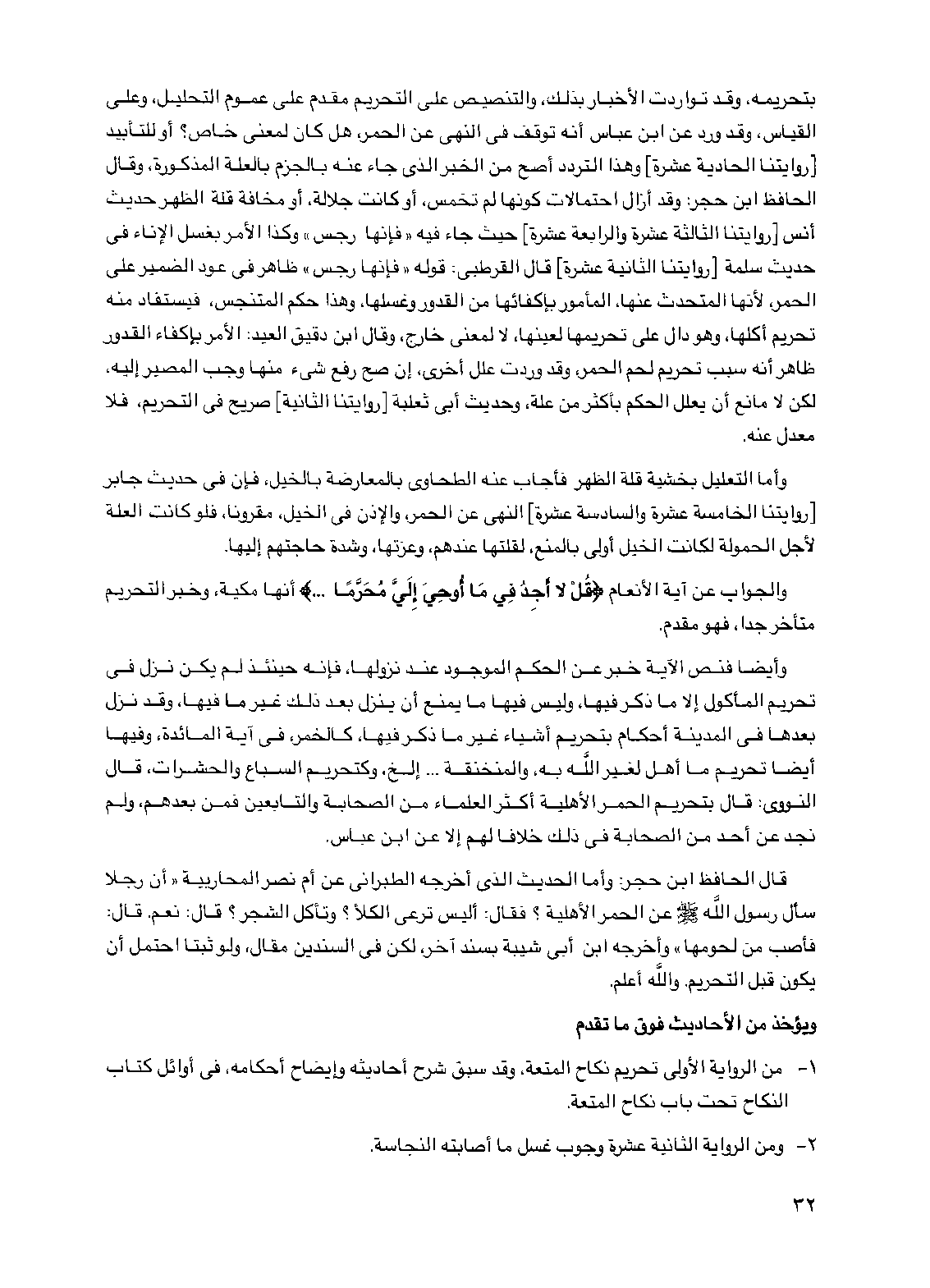 بتحريمه، وقد تواردت الأخبار بذلك، والتنصيص على التحريم مقدم على عموم التحليل، وعلى القياس، وقد ورد عن ابن عباس أنه توقف في النهي عن الحمر، هل كان لمعنى خاص؟ أو للتأبيد [روايتنا الحادية عشرة] وهذا التردد أصح من الخبر الذي جاء عنه بالجزم بالعلة المذكورة. وقال الحافظ ابن حجر: وقد أزال احتمالات كونها لم تخمس، أو كانت جلالة، أو مخافة قلة الظهر حديث أنس [روايتنا الثالثة عشرة والرابعة عشرة] حيث جاء فيه "فإنها رجس" وكذا الأمر بغسل الإناء في حديث سلمة [روايتنا الثانية عشرة] قال القرطبي: قوله "فإنها رجس" ظاهر في عود الضمير على الحمر، لأنها المتحدث عنها، المأمور بإكفائها من القدور وغسلها، وهذا حكم المتنجس، فيستفاد منه تحريم أكلها، وهو دال على تحريمها لعينها، لا لمعنى خارج، وقال ابن دقيق العيد: الأمر بإكفاء القدور ظاهر أنه سبب تحريم لحم الحمر، وقد وردت علل أخرى، إن صح رفع شيء منها وجب المصير إليه، لكن لا مانع أن يعلل الحكم بأكثر من علة، وحديث أبي ثعلبة [روايتنا الثانية] صريح في التحريم، فلا معدل عنه.