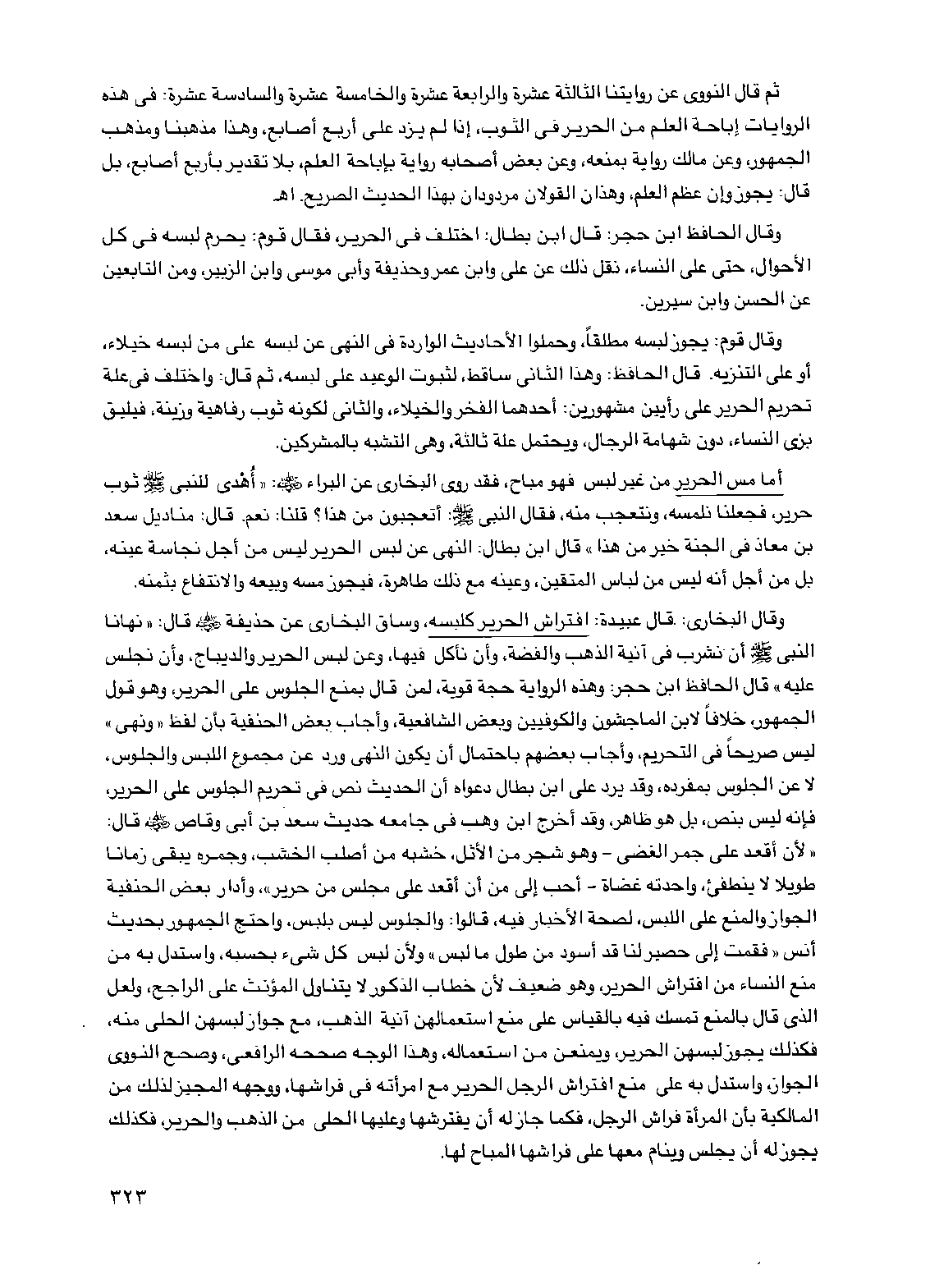 وقال البخاري: قال عبيدة: افتراش الحرير كلبسه، وساق البخاري عن حذيفة رضي الله عنه قال: "نهانا النبي صلى الله عليه وسلم أن نشرب في آنية الذهب والفضة، وأن نأكل فيها، وعن لبس الحرير والديباج، وأن نجلس عليه" قال الحافظ ابن حجر: وهذه الرواية حجة قوية، لمن قال بمنع الجلوس على الحرير، وهو قول الجمهور، خلافاً لابن الماجشون والكوفيين وبعض الشافعية، وأجاب بعض الحنفية بأن لفظ "ونهى" ليس صريحاً في التحريم، وأجاب بعضهم باحتمال أن يكون النهي ورد عن مجموع اللبس والجلوس، لا عن الجلوس بمفرده، وقد يرد على ابن بطال دعواه أن الحديث نص في تحريم الجلوس على الحرير، فإنه ليس بنص، بل هو ظاهر، وقد أخرج ابن وهب في جامعه حديث سعد بن أبي وقاص رضي الله عنه قال: "لأن أقعد على جمر الغضى -وهو شجر من الأثل، خشبه من أصلب الخشب، وجمره يبقى زماناً طويلاً لا ينطفئ، واحدته غضاة -أحب إلي من أن أقعد على مجلس من حرير"، وأدار بعض الحنفية الجواز والمنع على اللبس، لصحة الأخبار فيه، قالوا: والجلوس ليس بلبس، واحتج الجمهور بحديث أنس "فقمت إلى حصير لنا قد أسود من طول ما لبس" ولأن لبس كل شيء بحسبه، واستدل به من منع النساء من افتراش الحرير، وهو ضعيف لأن خطاب الذكور لا يتناول المؤنث على الراجح، ولعل الذي قال بالمنع تمسك فيه بالقياس على منع استعمالهن آنية الذهب، مع جواز لبسهن الحلي منه، فكذلك يجوز لبسهن الحرير، ويمنعن من استعماله، وهذا الوجه صححه الرافعي، وصحح النووي الجواز، واستدل به على منع افتراش الرجل الحرير مع امرأته في فراشها، ووجهه المجيز لذلك من المالكية بأن المرأة فراش الرجل، فكما جاز له أن يفترشها وعليها الحلي من الذهب والحرير، فكذلك يجوز له أن يجلس وينام معها على فراشها المباح لها.