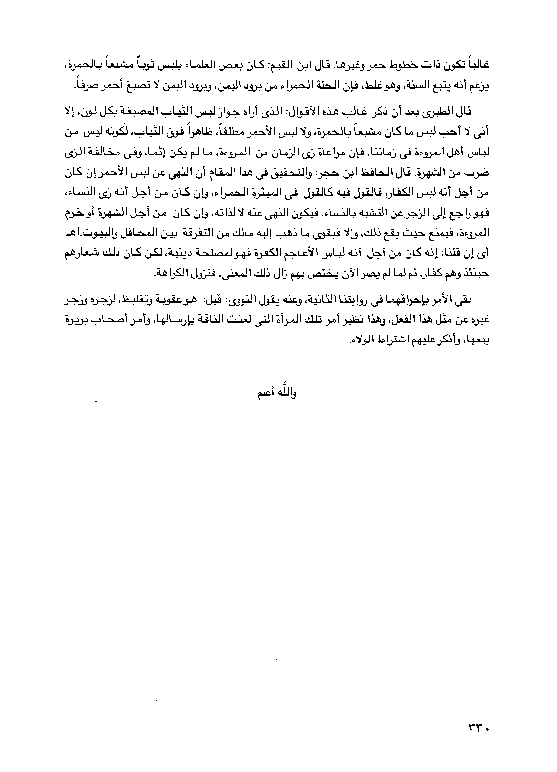 قال الطبري بعد أن ذكر غالب هذه الأقوال: الذي أراه جواز لبس الثياب المصبغة بكل لون، إلا أني لا أحب لبس ما كان مشبعاً بالحمرة، ولا لبس الأحمر مطلقاً، ظاهراً فوق الثياب، لكونه ليس من لباس أهل المروءة في زماننا، فإن مراعاة زي الزمان من المروءة، ما لم يكن إثماً، وفي مخالفة الزي ضرب من الشهرة. قال الحافظ ابن حجر: والتحقيق في هذا المقام أن النهي عن لبس الأحمر إن كان من أجل أنه لبس الكفار، فالقول فيه كالقول في الميثرة الحمراء، وإن كان من أجل أنه زي النساء، فهو راجع إلى الزجر عن التشبه بالنساء، فيكون النهي عنه لا لذاته، وإن كان من أجل الشهرة أو خرم المروءة، فيمنع حيث يقع ذلك، وإلا فيقوى ما ذهب إليه مالك من التفرقة بين المحافل والبيوت. اهـ أي إن قلنا: إنه كان من أجل أنه لباس الأعاجم الكفرة فهو لمصلحة دينية، لكن كان ذلك شعارهم حينئذ وهم كفار، ثم لما لم يصر الآن يختص بهم زال ذلك المعنى، فتزول الكراهة.