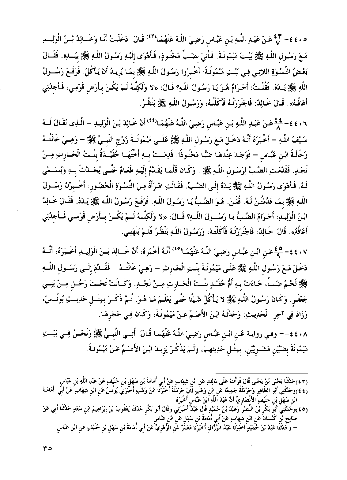 4407 - عن ابن عباس رضي الله عنهما أنه أخبره، أن خالد بن الوليد أخبره، أنه دخل مع رسول الله صلى الله عليه وسلم على ميمونة بنت الحارث -وهي خالته- فقدم إلى رسول الله صلى الله عليه وسلم لحم ضب، جاءت به أم حفيد بنت الحارث من نجد. وكانت تحت رجل من بني جعفر. وكان رسول الله صلى الله عليه وسلم لا يأكل شيئاً حتى يعلم ما هو. ثم ذكر بمثل حديث يونس، وزاد في آخر الحديث: وحدثه ابن الأصم عن ميمونة، وكان في حجرها.