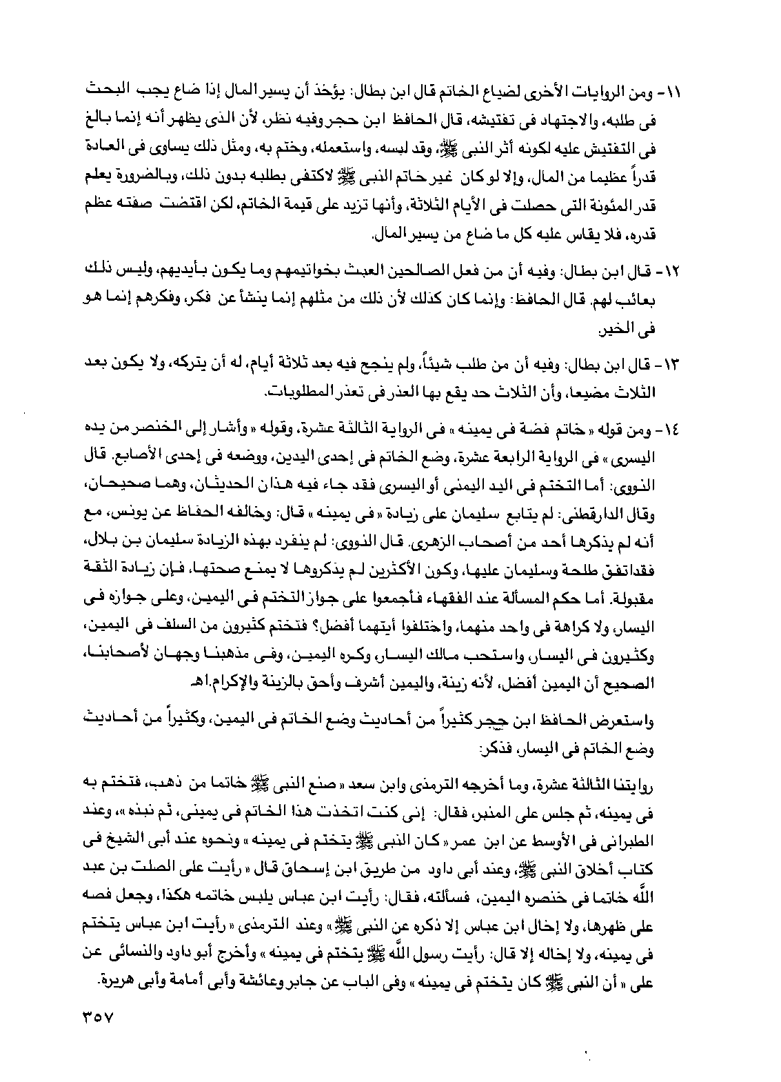 11 - ومن الروايات الأخرى لضياع الخاتم قال ابن بطال: يؤخذ أن يسير المال إذا ضاع يجب البحث في طلبه، والاجتهاد في تفتيشه، قال الحافظ ابن حجر وفيه نظر، لأن الذي يظهر أنه إنما بالغ في التفتيش عليه لكونه أثر النبي صلى الله عليه وسلم، وقد لبسه، واستعمله، وختم به، ومثل ذلك يساوي في العادة قدراً عظيماً من المال، وإلا لو كان غير خاتم النبي صلى الله عليه وسلم لاكتفى بطلبه بدون ذلك، وبالضرورة يعلم قدر المئونة التي حصلت في الأيام الثلاثة، وأنها تزيد على قيمة الخاتم، لكن اقتضت صفته عظم قدره، فلا يقاس عليه كل ما ضاع من يسير المال.