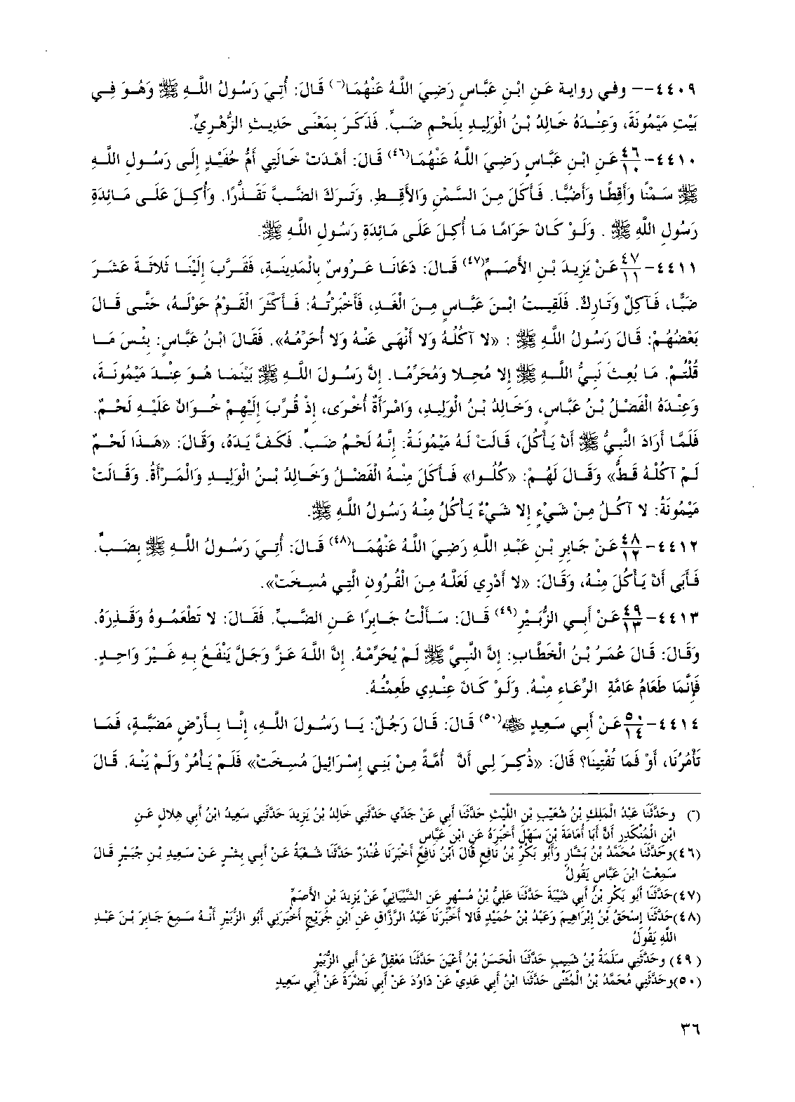 4411 - عن يزيد بن الأصم قال: دعانا عروس بالمدينة، فقرب إلينا ثلاثة عشر ضباً، فآكل وتارك. فلقيت ابن عباس من الغد، فأخبرته: فأكثر القوم حوله، حتى قال بعضهم: قال رسول الله صلى الله عليه وسلم: "لا آكله ولا أنهى عنه ولا أحرمه". فقال ابن عباس: بئس ما قلتم. ما بعث نبي الله صلى الله عليه وسلم إلا محلاً ومحرماً. إن رسول الله صلى الله عليه وسلم بينما هو عند ميمونة، وعنده الفضل بن عباس، وخالد بن الوليد، وامرأة أخرى، إذ قرب إليهم خوان عليه لحم. فلما أراد النبي صلى الله عليه وسلم أن يأكل، قالت له ميمونة: إنه لحم ضب. فكف يده، وقال: "هذا لحم لم آكله قط" وقال لهم: "كلوا" فأكل منه الفضل وخالد بن الوليد والمرأة. وقالت ميمونة: لا آكل من شيء إلا شيء يأكل منه رسول الله صلى الله عليه وسلم.