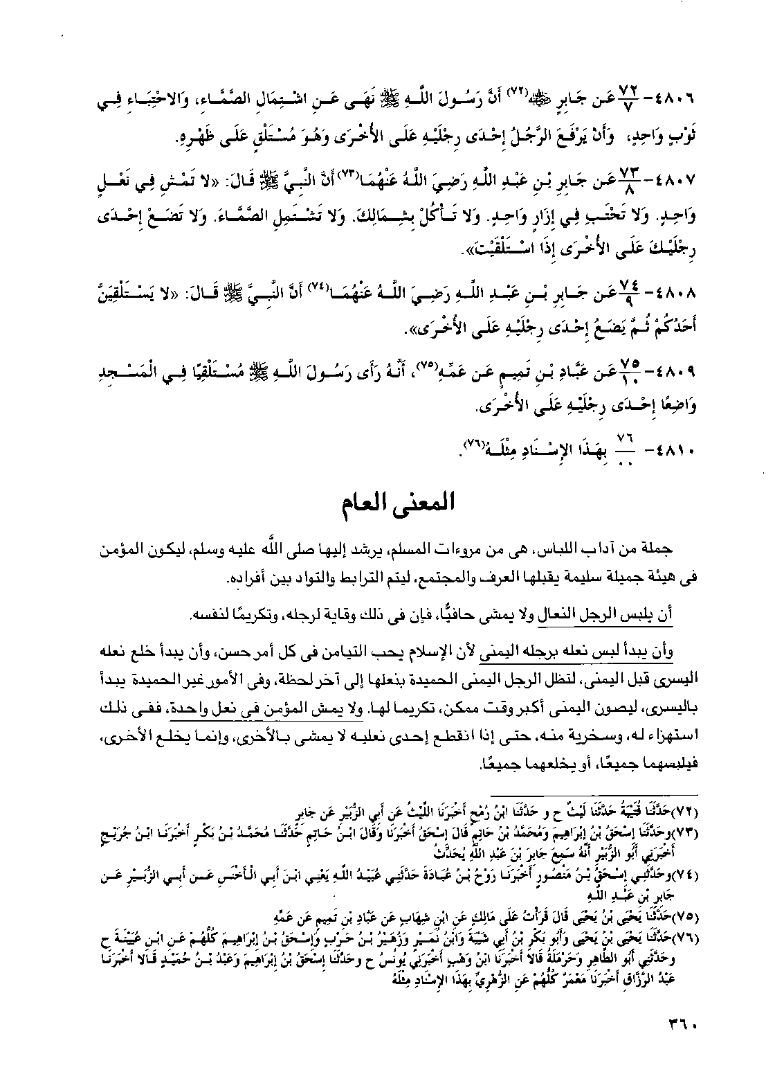 4807 - عن جابر بن عبد الله رضي الله عنهما أن النبي صلى الله عليه وسلم قال: "لا تمش في نعل واحد. ولا تحتب في إزار واحد. ولا تأكل بشمالك. ولا تشتمل الصماء. ولا تضع إحدى رجليك على الأخرى إذا استلقيت".
