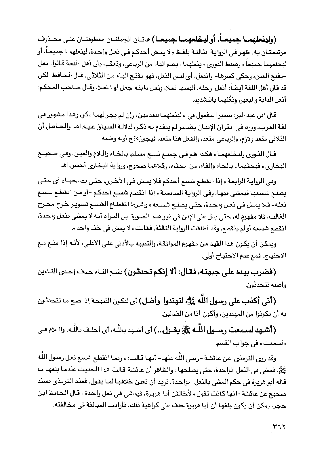 (ولينعلهما جميعاً، أو ليخلعهما جميعاً) هاتان الجملتان معطوفتان على محذوف مرتبطتان به، ظهر في الرواية الثالثة بلفظ "لا يمش أحدكم في نعل واحدة، لينعلهما جميعاً، أو ليخلعهما جميعاً" وضبط النووي "ينعلهما" بضم الياء من الرباعي، وتعقب بأن أهل اللغة قالوا: نعل -بفتح العين، وحكي كسرها- وانتعل، أي لبس النعل، فهو بفتح الياء من الثلاثي، قال الحافظ: لكن قد قال أهل اللغة أيضاً: أنعل رجله، ألبسها نعلاً، ونعل دابته جعل لها نعلاً، وقال صاحب المحكم: أنعل الدابة والبعير، ونعلهما بالتشديد.