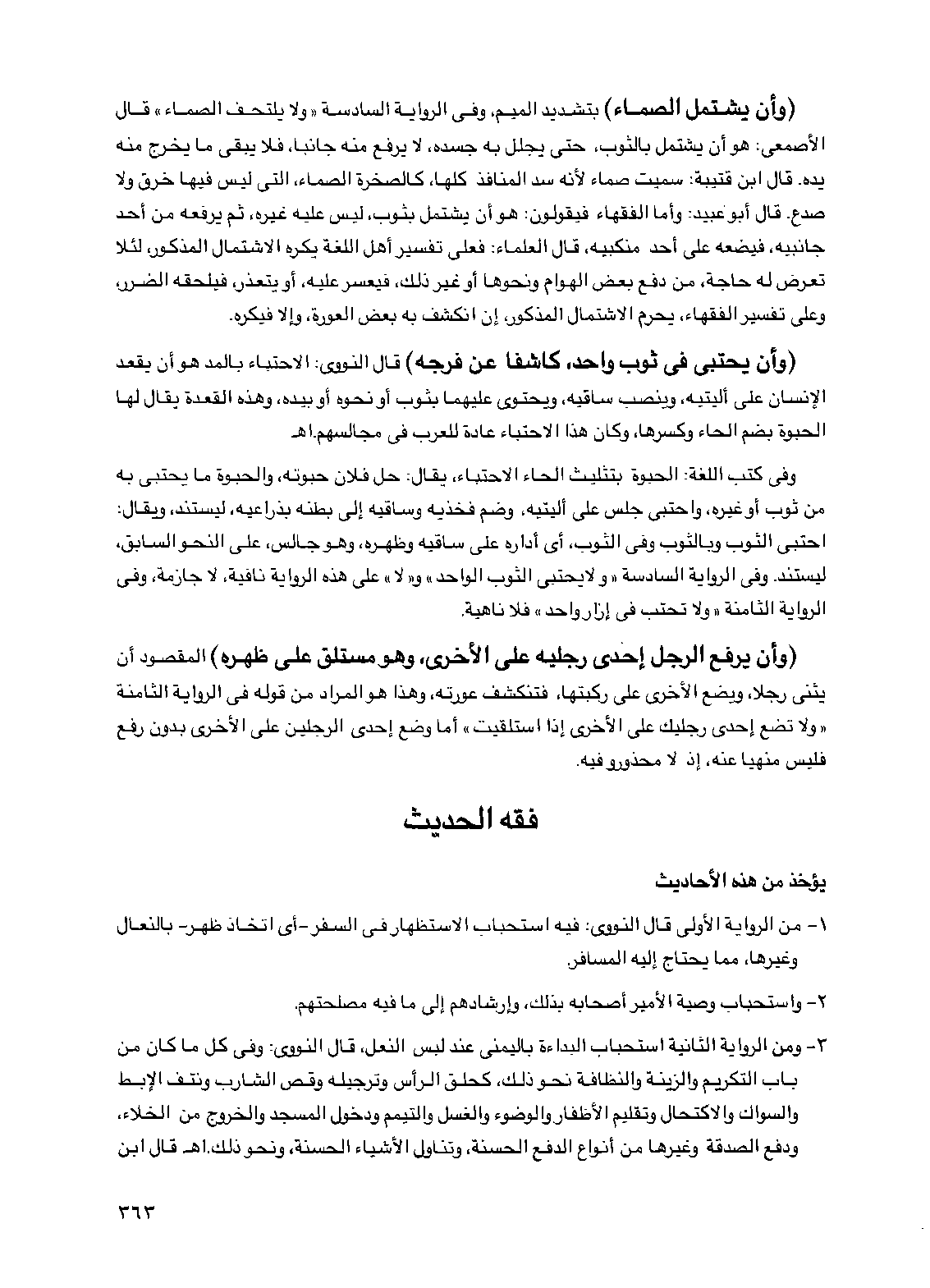 (وأن يشتمل الصماء) بتشديد الميم، وفي الرواية السادسة "ولا يلتحف الصماء" قال الأصمعي: هو أن يشتمل بالثوب، حتى يجلل به جسده، لا يرفع منه جانباً، فلا يبقى ما يخرج منه يده. قال ابن قتيبة: سميت صماء لأنه سد المنافذ كلها، كالصخرة الصماء، التي ليس فيها خرق ولا صدع. قال أبو عبيد: وأما الفقهاء فيقولون: هو أن يشتمل بثوب، ليس عليه غيره، ثم يرفعه من أحد جانبيه، فيضعه على أحد منكبيه، قال العلماء: فعلى تفسير أهل اللغة يكره الاشتمال المذكور، لئلا تعرض له حاجة، من دفع بعض الهوام ونحوها أو غير ذلك، فيعسر عليه، أو يتعذر، فيلحقه الضرر، وعلى تفسير الفقهاء، يحرم الاشتمال المذكور، إن انكشف به بعض العورة، وإلا فيكره.