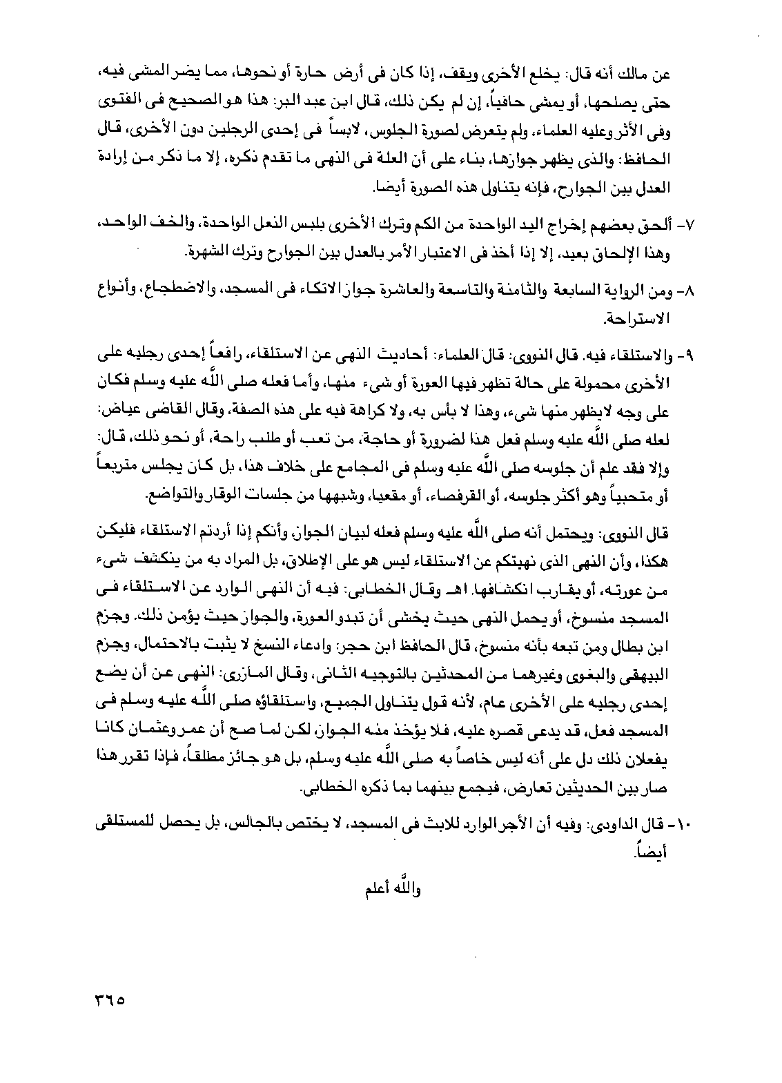 9 - والاستلقاء فيه. قال النووي: قال العلماء: أحاديث النهي عن الاستلقاء، رافعاً إحدى رجليه على الأخرى محمولة على حالة تظهر فيها العورة أو شيء منها، وأما فعله صلى الله عليه وسلم فكان على وجه لا يظهر منها شيء، وهذا لا بأس به، ولا كراهة فيه على هذه الصفة، وقال القاضي عياض: لعله صلى الله عليه وسلم فعل هذا لضرورة أو حاجة، من تعب أو طلب راحة، أو نحو ذلك، قال: وإلا فقد علم أن جلوسه صلى الله عليه وسلم في المجامع على خلاف هذا، بل كان يجلس متربعاً أو متحبياً وهو أكثر جلوسه، أو القرفصاء، أو مقعياً، وشبهها من جلسات الوقار والتواضع.