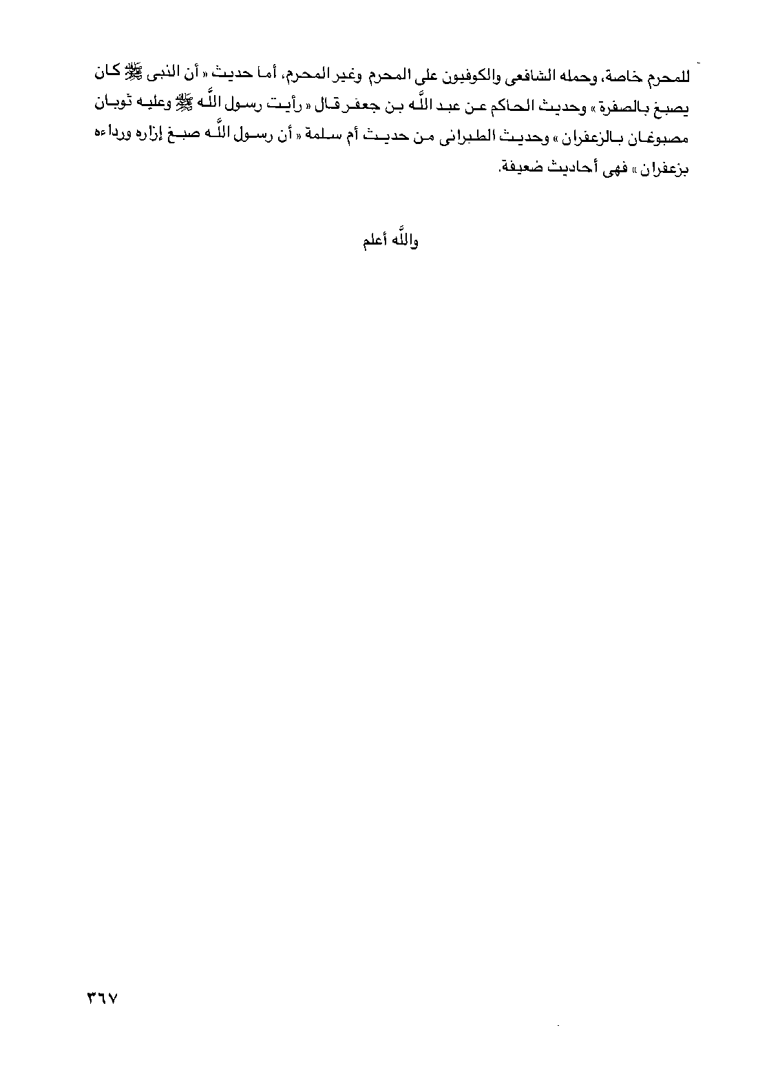للمحرم خاصة، وحمله الشافعي والكوفيون على المحرم وغير المحرم، أما حديث "أن النبي صلى الله عليه وسلم كان يصبغ بالصفرة" وحديث الحاكم عن عبد الله بن جعفر قال "رأيت رسول الله صلى الله عليه وسلم وعليه ثوبان مصبوغان بالزعفران" وحديث الطبراني من حديث أم سلمة "أن رسول الله صبغ إزاره ورداءه بزعفران" فهي أحاديث ضعيفة.