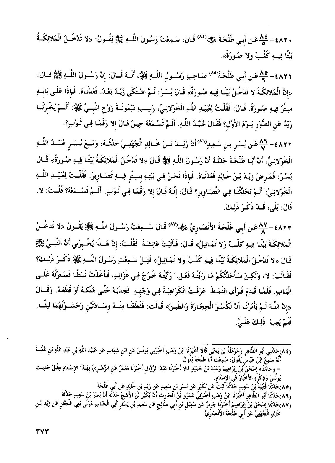 4821 - عن أبي طلحة صاحب رسول الله صلى الله عليه وسلم، أنه قال: إن رسول الله صلى الله عليه وسلم قال: "إن الملائكة لا تدخل بيتاً فيه صورة" قال بسر: ثم اشتكى زيد بعد. فعدناه. فإذا على بابه ستر فيه صورة. قال: فقلت لعبيد الله الخولاني، ربيب ميمونة زوج النبي صلى الله عليه وسلم: ألم يخبرنا زيد عن الصور يوم الأول؟ فقال عبيد الله. ألم تسمعه حين قال إلا رقماً في ثوب؟ .