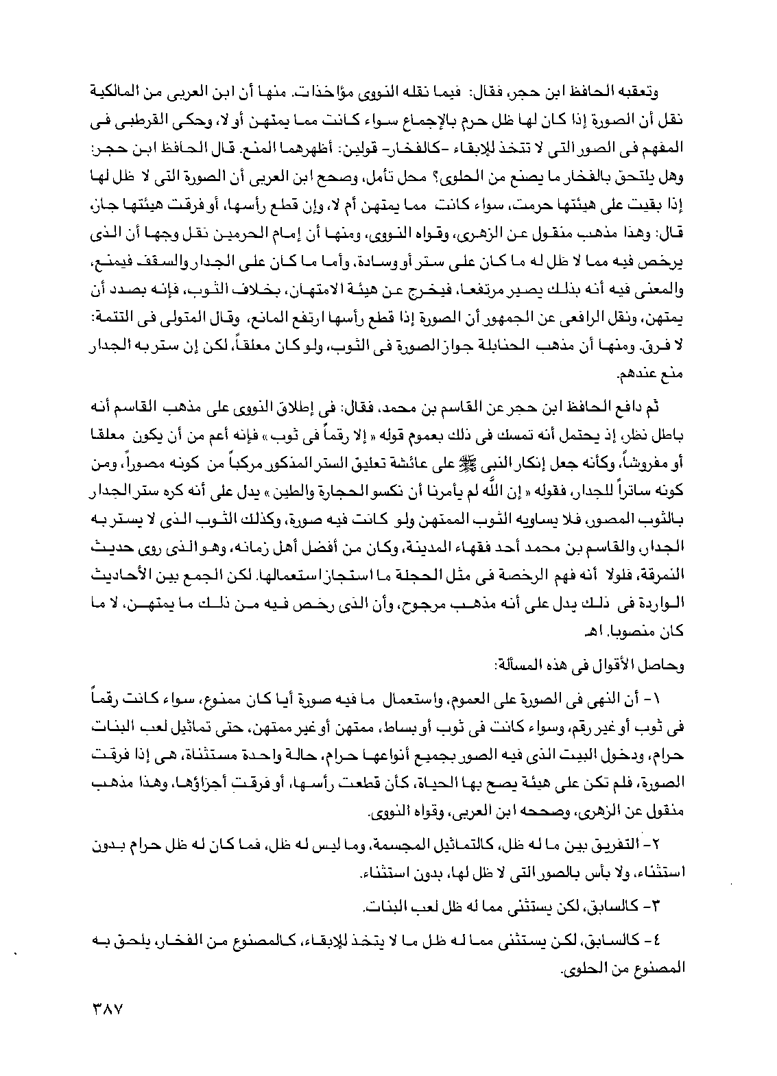 وتعقبه الحافظ ابن حجر، فقال: فيما نقله النووي مؤاخذات. منها أن ابن العربي من المالكية نقل أن الصورة إذا كان لها ظل حرم بالإجماع سواء كانت مما يمتهن أو لا، وحكى القرطبي في المفهم في الصور التي لا تتخذ للإبقاء -كالفخار- قولين: أظهرهما المنع. قال الحافظ ابن حجر: وهل يلتحق بالفخار ما يصنع من الحلوى؟ محل نأمل، وصحح ابن العربي أن الصورة التي لا ظل لها إذا بقيت على هيئتها حرمت، سواء كانت مما يمتهن أم لا، وإن قطع رأسها، أو فرقت هيئتها جاز، قال: وهذا مذهب منقول عن الزهري، وقواه النووي، ومنها أن إمام الحرمين نقل وجهاً أن الذي يرخص فيه مما لا ظل له ما كان على ستر أو وسادة، وأما ما كان على الجدار والسقف فيمنع، والمعنى فيه أنه بذلك يصير مرتفعاً، فيخرج عن هيئة الامتهان، بخلاف الثوب، فإنه بصدد أن يمتهن، ونقل الرافعي عن الجمهور أن الصورة إذا قطع رأسها ارتفع المانع، وقال المتولي في التتمة: لا فرق. ومنها أن مذهب الحنابلة جواز الصورة في الثوب، ولو كان معلقاً، لكن إن ستر به الجدار منع عندهم.