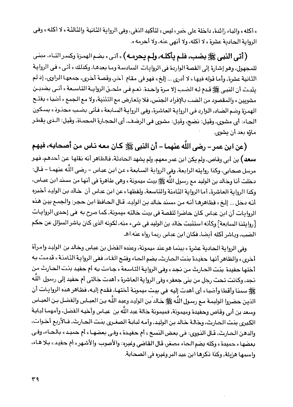(عن ابن عمر -رضي الله عنهما- أن النبي صلى الله عليه وسلم كان معه ناس من أصحابه، فيهم سعد) بن أبي وقاص، ولم يكن ابن عمر معهم، ولم يشهد الحادثة، فالظاهر أنه نقلها عن أحدهم، فهو مرسل صحابي، وكذا روايته الرابعة، وفي الرواية السابعة "عن ابن عباس -رضي الله عنهما- قال: دخلت أنا وخالد بن الوليد مع رسول الله صلى الله عليه وسلم بيت ميمونة" وهي ظاهرة في أنها من مسند ابن عباس، وكذا الرواية العاشرة، أما الرواية الثامنة والتاسعة، ولفظها "عن ابن عباس أن خالد بن الوليد أخبره أنه دخل .... إلخ" فظاهرها أنه من مسند خالد بن الوليد. قال الحافظ ابن حجر: والجمع بين هذه الروايات أن ابن عباس كان حاضراً للقصة في بيت خالته ميمونة، كما صرح به في إحدى الروايات [روايتنا السابعة] وكأنه استثبت خالد بن الوليد في شيء منه، لكونه الذي كان باشر السؤال عن حكم الضب، وباشر أكله أيضاً، فكان ابن عباس ربما رواه عنه. اهـ