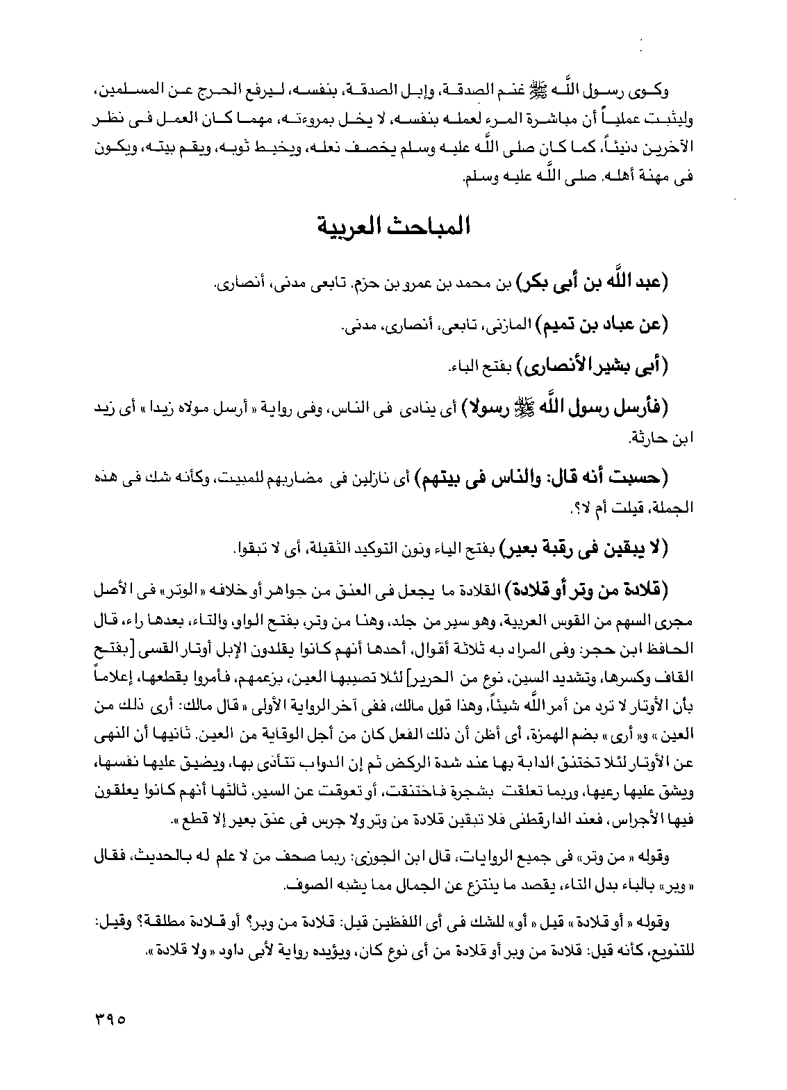 (قلادة من وتر أو قلادة) القلادة ما يجعل في العنق من جواهر أو خلافه "الوتر" في الأصل مجرى السهم من القوس العربية، وهو سير من جلد، وهنا من وتر، بفتح الواو، والتاء، بعدها راء، قال الحافظ ابن حجر: وفي المراد به ثلاثة أقوال، أحدها أنهم كانوا يقلدون الإبل أوتار القسي [بفتح القاف وكسرها، وتشديد السين، نوع من الحرير] لئلا تصيبها العين، بزعمهم، فأمروا بقطعها، إعلاماً بأن الأوتار لا ترد من أمر الله شيئاً، وهذا قول مالك، ففي آخر الرواية الأولى "قال مالك: أرى ذلك من العين" و"أرى" بضم الهمزة، أي أظن أن ذلك الفعل كان من أجل الوقاية من العين. ثانيها أن النهي عن الأوتار لئلا تختنق الدابة بها عند شدة الركض ثم إن الدواب تتأذى بها، ويضيق عليها نفسها، ويشق عليها رعيها، وربما تعلقت بشجرة فاختنقت، أو تعوقت عن السير، ثالثها أنهم كانوا يعلقون فيها الأجراس، فعند الدارقطني فلا تبقين قلادة من وتر ولا جرس في عنق بعير إلا قطع".