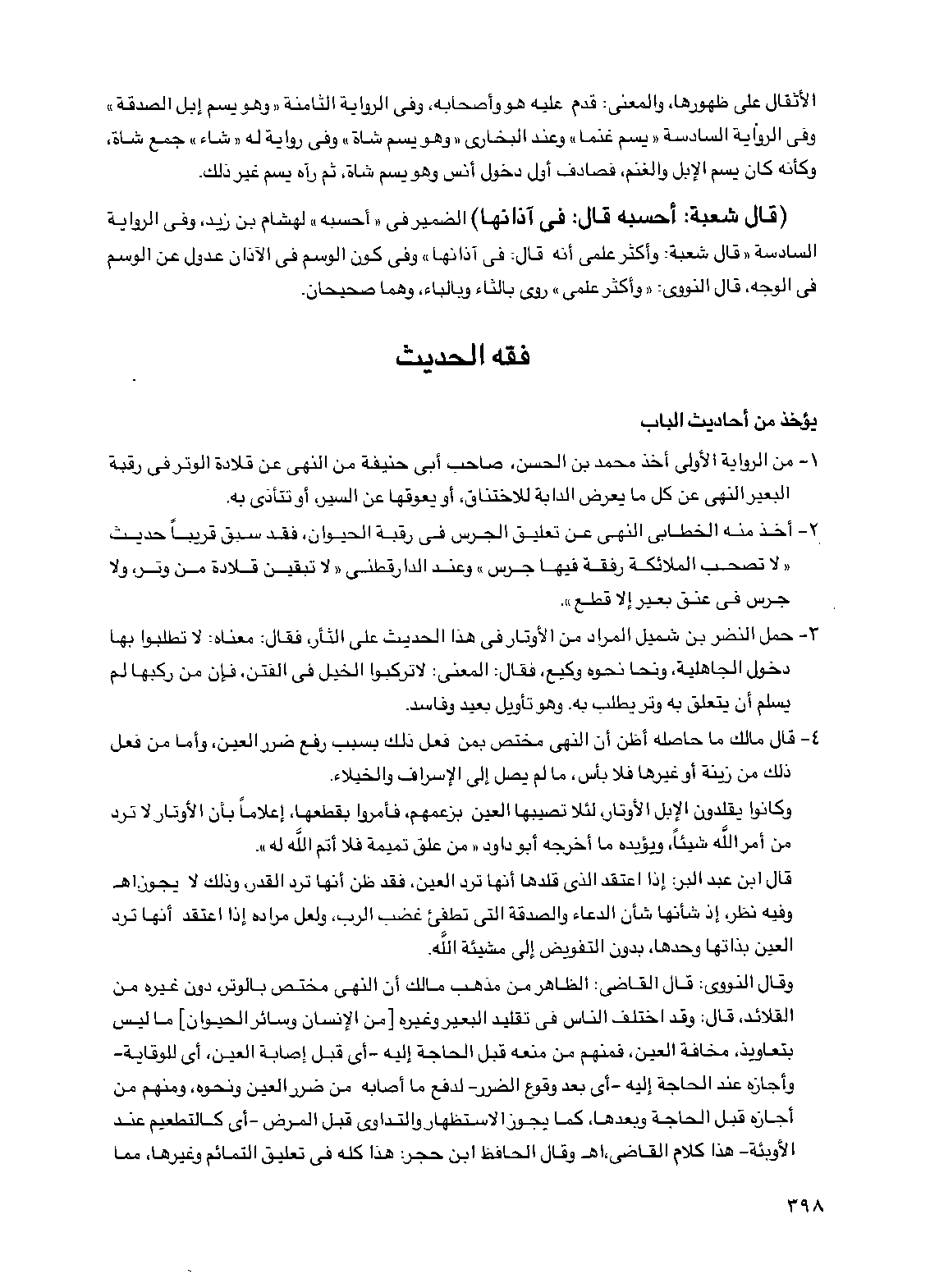 1 - من الرواية الأولى أخذ محمد بن الحسن، صاحب أبي حنيفة من النهي عن قلادة الوتر في رقبة البعير النهي عن كل ما يعرض الدابة للاختناق، أو يعوقها عن السير، أو تتأذى به.