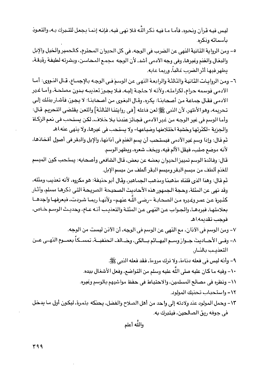 6 - ومن الروايات الثانية والثالثة والرابعة النهي عن الوسم في الوجه بالإجماع، قال النووي: أما الآدمي فوسمه حرام، لكرامته، ولأنه لا حاجة إليه، فلا يجوز تعذيبه بدون مصلحة، وأما غير الآدمي فقال جماعة من أصحابنا: يكره، وقال البغوي من أصحابنا: لا يجوز، فأشار بذلك إلى تحريمه، وهو الأظهر، لأن النبي صلى الله عليه وسلم لعن فاعله [في روايتنا الثالثة] واللعن يقتضي التحريم. قال: وأما الوسم في غير الوجه من غير الآدمي فجائز عندنا بلا خلاف، لكن يستحب في نعم الزكاة والجزية -لكثرتها وخشية اختلاطها وضياعها- ولا يستحب في غيرها، ولا ينهي عنه. اهـ