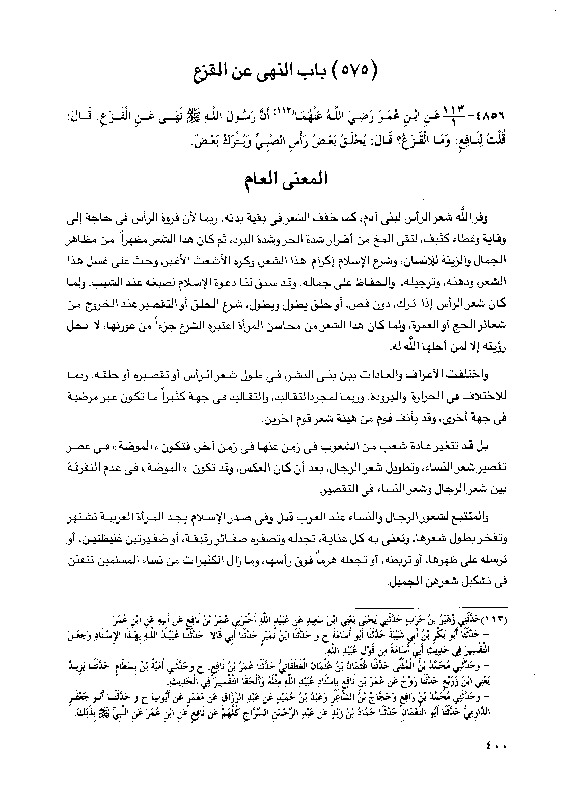 4856 - عن ابن عمر رضي الله عنهما أن رسول الله صلى الله عليه وسلم نهى عن القزع. قال: قلت لنافع: وما القزع؟ قال: يحلق بعض رأس الصبي ويترك بعض.
