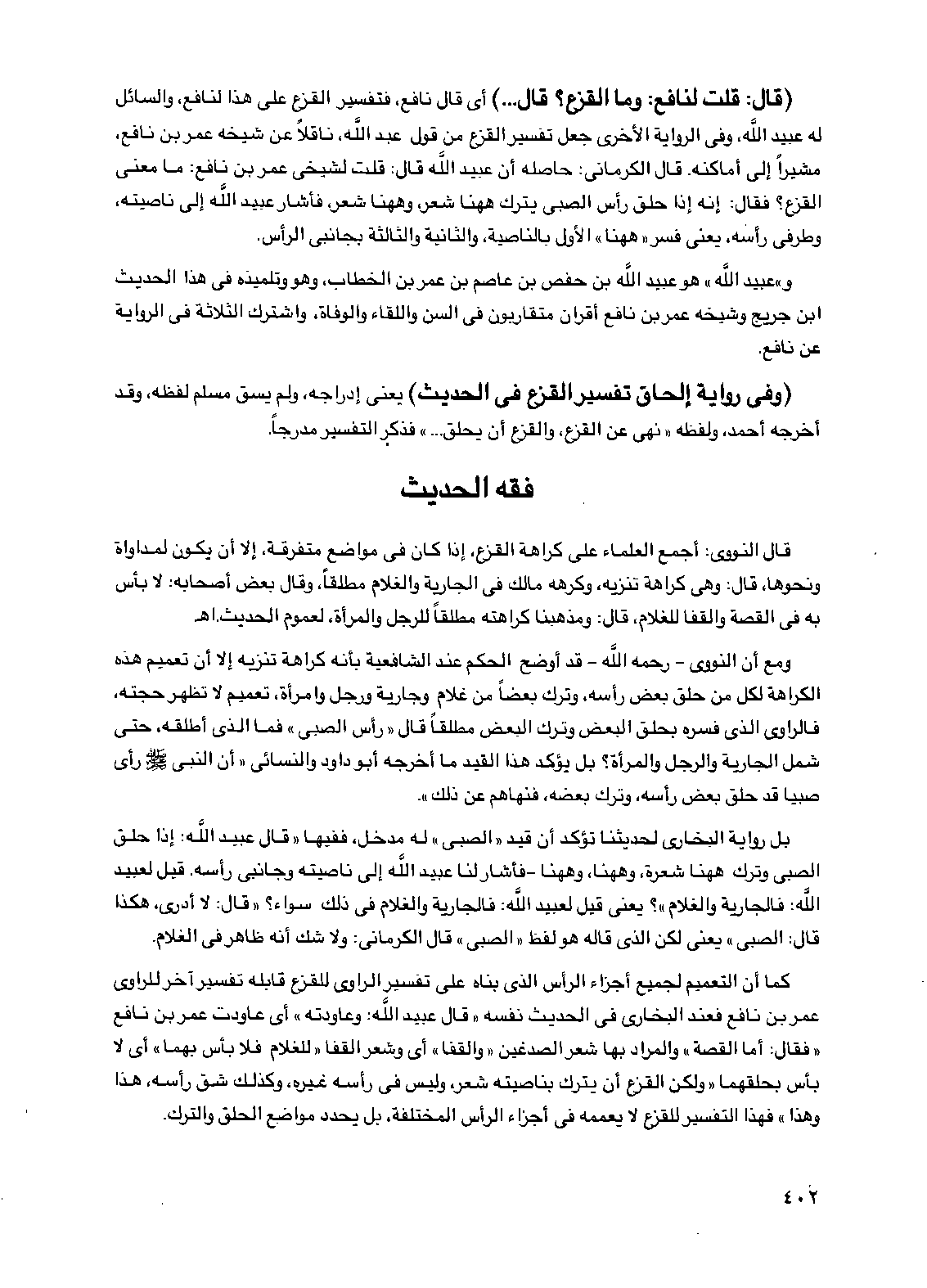 ومع أن النووي -رحمه الله- قد أوضح الحكم عند الشافعية بأنه كراهة تنزيه إلا أن تعميم هذه الكراهة لكل من حلق بعض رأسه، وترك بعضاً من غلام وجارية ورجل وامرأة، تعميم لا تظهر حجته، فالراوي الذي فسره بحلق البعض وترك البعض مطلقاً قال "رأس الصبي" فما الذي أطلقه، حتى شمل الجارية والرجل والمرأة؟ بل يؤكد هذا القيد ما أخرجه أبو داود والنسائي "أن النبي صلى الله عليه وسلم رأى صبياً قد حلق بعض رأسه، وترك بعضه، فنهاهم عن ذلك".