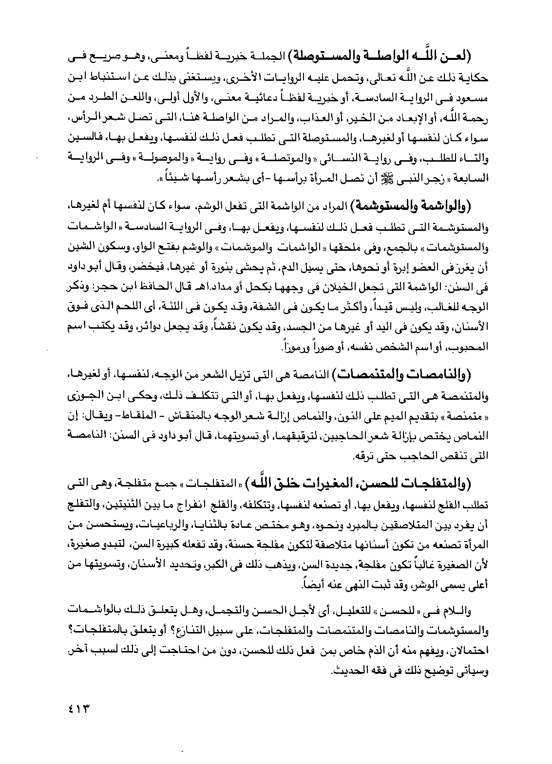 (والنامصات والمتنمصات) النامصة هي التي تزيل الشعر من الوجه، لنفسها، أو لغيرها، والمتنمصة هي التي تطلب ذلك لنفسها، ويفعل بها، أو التي تتكلف ذلك، وحكى ابن الجوزي "متمنصة" بتقديم الميم على النون، والنماص إزالة شعر الوجه بالمنقاش -الملقاط- ويقال: إن النماص يختص بإزالة شعر الحاجبين، لترقيقهما، أو تسويتهما، قال أبو داود في السنن: النامصة التي تنقص الحاجب حتى ترقه.