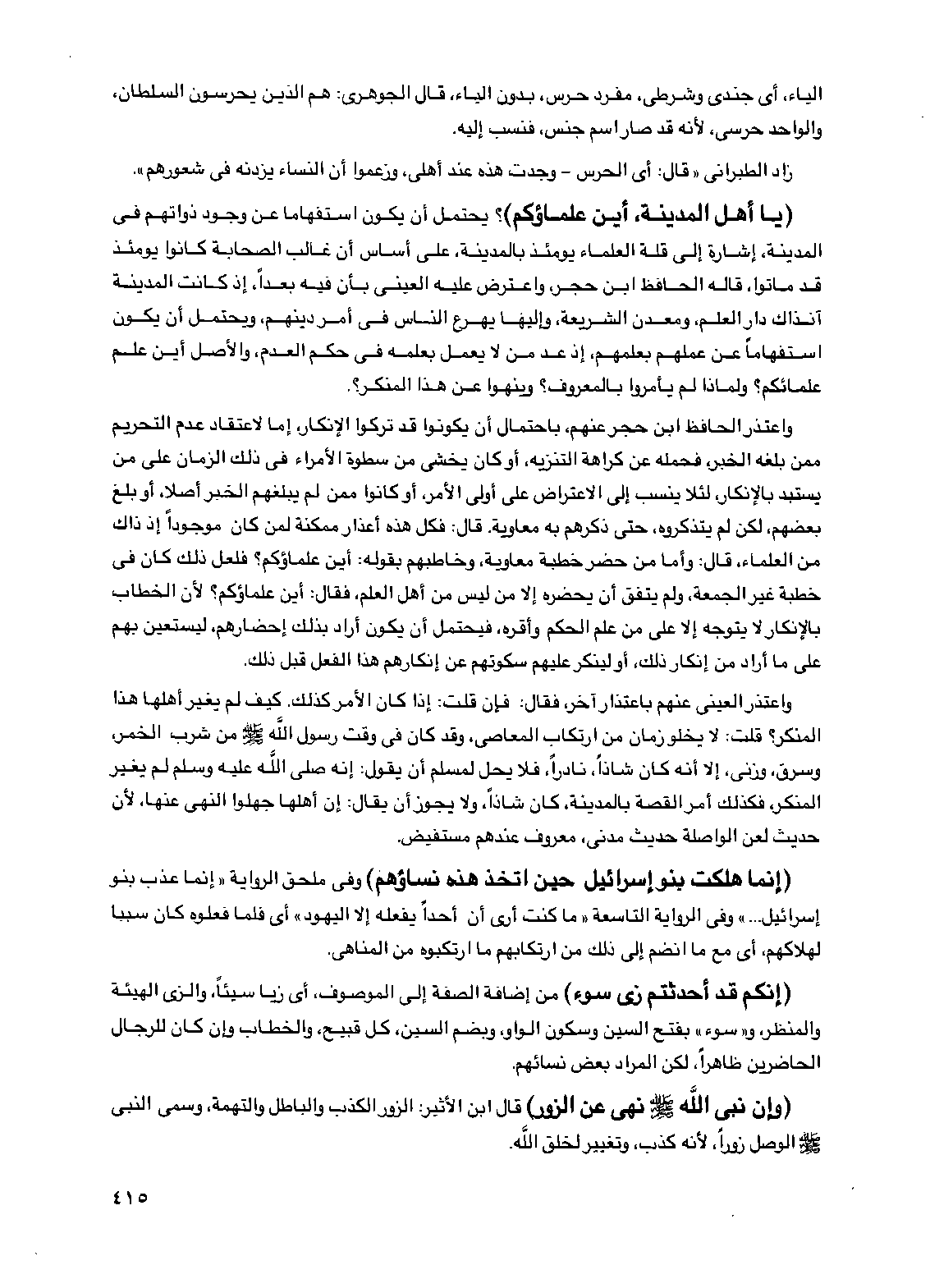 (يا أهل المدينة، أين علماؤكم؟ ) يحتمل أن يكون استفهاماً عن وجود ذواتهم في المدينة، إشارة إلى قلة العلماء يومئذ بالمدينة، على أساس أن غالب الصحابة كانوا يومئذ قد ماتوا، قاله الحافظ ابن حجر، واعترض عليه العيني بأن فيه بعداً، إذ كانت المدينة آنذاك دار العلم، ومعدن الشريعة، وإليها يهرع الناس في أمر دينهم، ويحتمل أن يكون استفهاماً عن عملهم بعلمهم، إذ عد من لا يعمل بعلمه في حكم العدم، والأصل أين علم علمائكم؟ ولماذا لم يأمروا بالمعروف؟ وينهوا عن المنكر؟ .