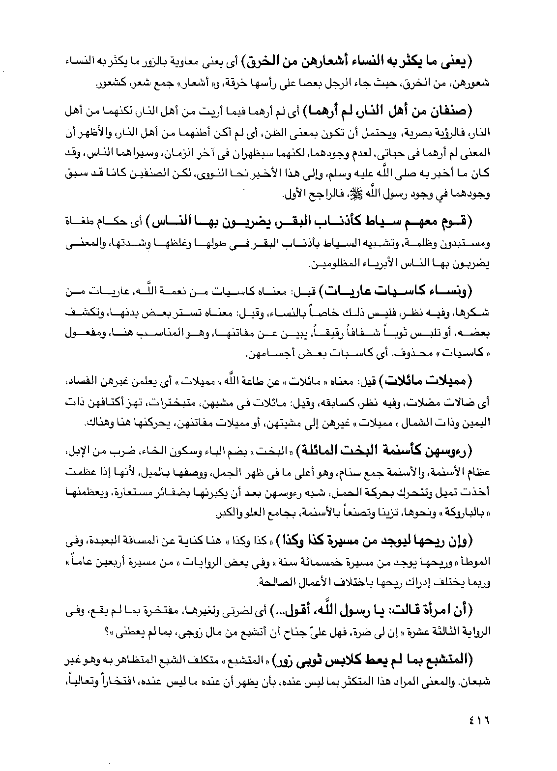 (ونساء كاسيات عاريات) قيل: معناه كاسيات من نعمة الله، عاريات من شكرها، وفيه نظر، فليس ذلك خاصاً بالنساء، وقيل: معناه تستر بعض بدنها، وتكشف بعضه، أو تلبس ثوباً شفافاً رقيقاً، يبين عن مفاتنها، وهو المناسب هنا، ومفعول "كاسيات" محذوف، أي كاسيات بعض أجسامهن.