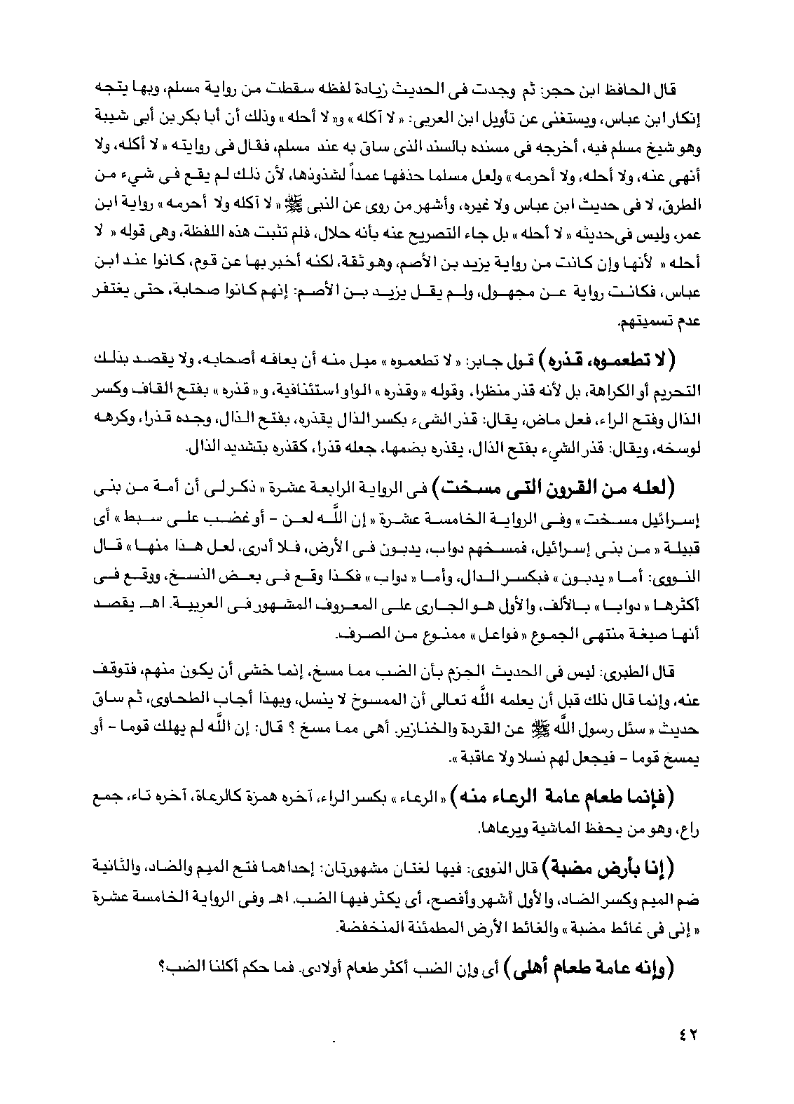 (لعله من القرون التي مسخت) في الرواية الرابعة عشرة "ذكر لي أن أمة من بني إسرائيل مسخت" وفي الرواية الخامسة عشرة "إن الله لعن -أو غضب على سبط" أي قبيلة "من بني إسرائيل، فمسخهم دواب، يدبون في الأرض، فلا أدري، لعل هذا منها" قال النووي: أما "يدبون" فبكسر الدال، وأما "دواب" فكذا وقع في بعض النسخ، ووقع في أكثرها "دواباً" بالألف، والأول هو الجاري على المعروف المشهور في العربية. اهـ يقصد أنها صيغة منتهى الجموع "فواعل" ممنوع من الصرف.