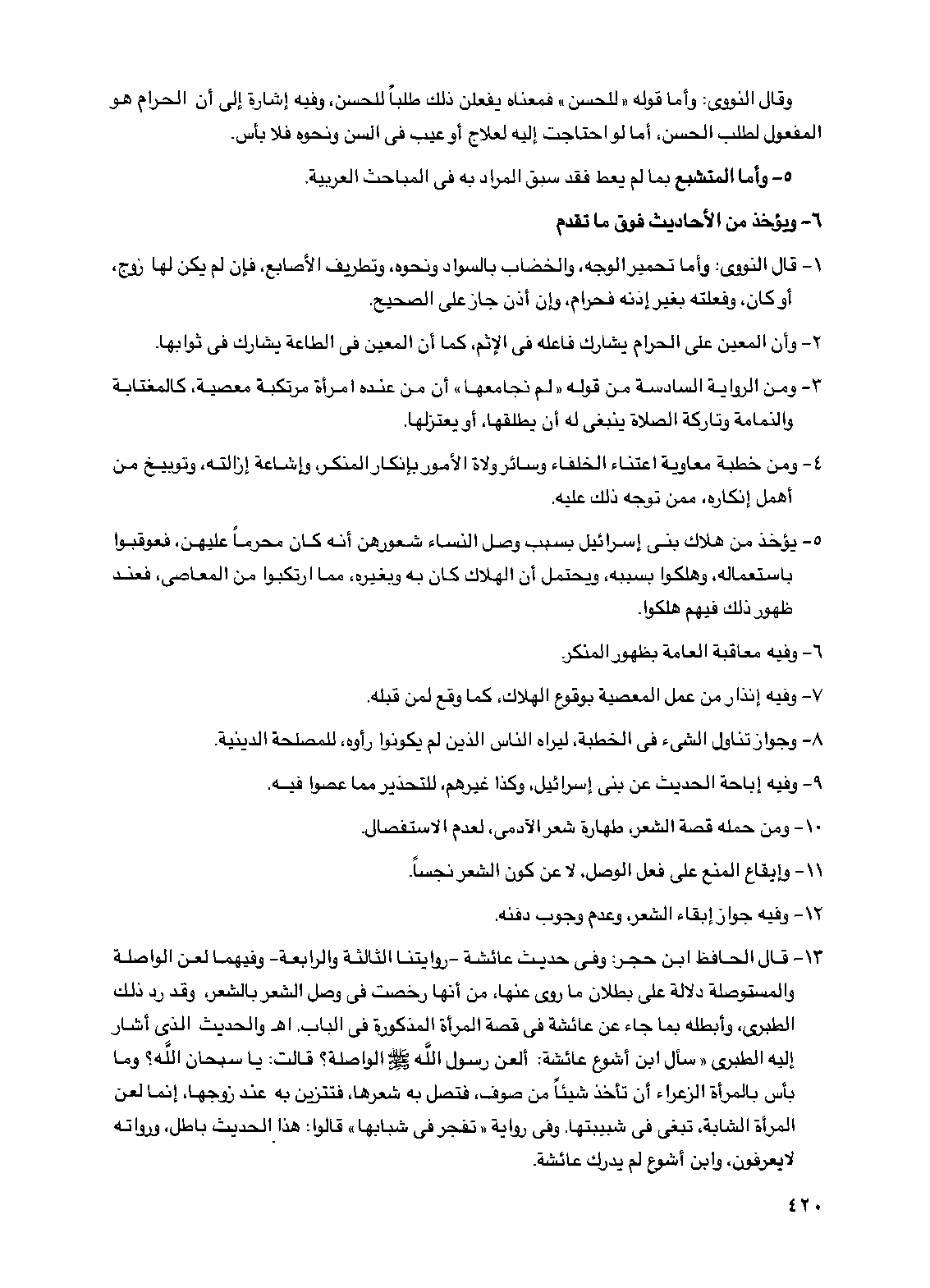 13 - قال الحافظ ابن حجر: وفي حديث -روايتنا الثالثة والرابعة- وفيهما لعن الواصلة والمستوصلة دلالة على بطلان ما روي عنها، من أنها رخصت في وصل الشعر بالشعر، وقد رد ذلك الطبري، وأبطله بما جاء عن عائشة في قصة المرأة المذكورة في الباب. اهـ والحديث الذي أشار إليه الطبري "سأل ابن أشوع عائشة: ألعن رسول الله صلى الله عليه وسلم الواصلة؟ قالت: يا سبحان الله؟ وما بأس بالمرأة الزعراء أن تأخذ شيئاً من صوف، فتصل به شعرها، فتتزين به عند زوجها، إنما لعن المرأة الشابة، تبغى في شبيبتها. وفي رواية "تفجر في شبابها" قالوا: هذا الحديث باطل، ورواته لا يعرفون، وابن أشوع لم يدرك عائشة.